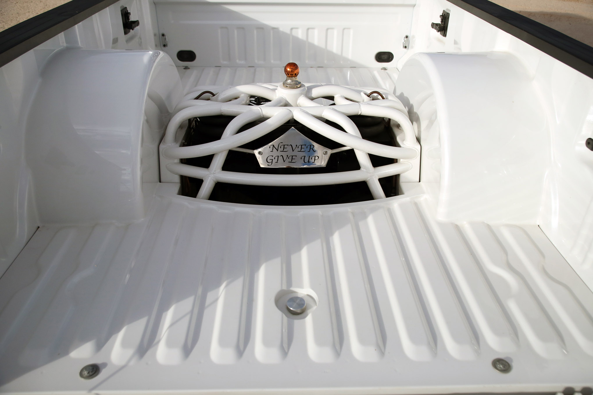 Custom “Never Give Up” badging, shaved fuel door, tubbed bed by Ekstensive, Gravel Empire grille, Klearz Manufacturing clear marker lights, Recon LED cab lights, Bullseye Retrofit's modified OEM LED headlights, finishing paint work done by Kolor Worx Paint and Body
