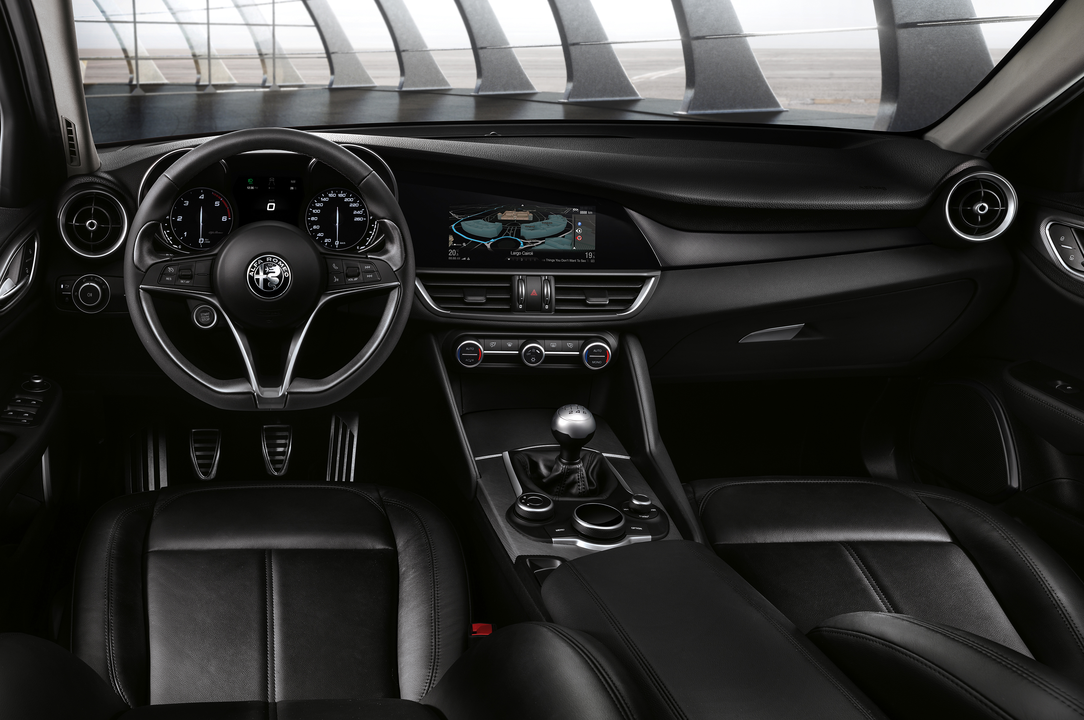 Inside, the 2017 Giulia features a new infotainment system with a 6.5-inch or 8.8-inch screen and can be controlled via a rotary knob. In addition to the two analog gauges, the Giulia also has a seven-inch TFT display. Leather upholstery with accent stitching is standard and the interior can be had with a choice of wood, aluminum, or carbon fiber trim. The car also features a flat-bottom steering wheel with the start/stop button integrated in it and a center stack angled towards the driver.