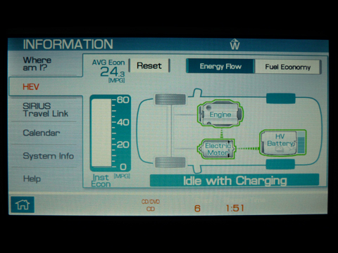 I wish there were a more obvious display function showing instant and average fuel economy, as in the Toyota Prius. I have no idea what my fuel economy was over the weekend because I could never find a mileage display, although I imagine one can be accessed through the navigation screen. (I only thought to look when I was driving.) That nav screen, by the way, has a great user interface. Several passengers were impressed by the graphics and all the functions that are accessed through it. After a couple of tries, I managed to SYNC my cell phone with Bluetooth and was able to access my call history and my address book. The display splits your address book into six or eight subcategories, like ABC, DEF, GHI, etc., according to the last names of your contacts. But when I brought up my address book, it showed only some of the entries on my phone, not all of them. That was annoying. The call history function works well, though.