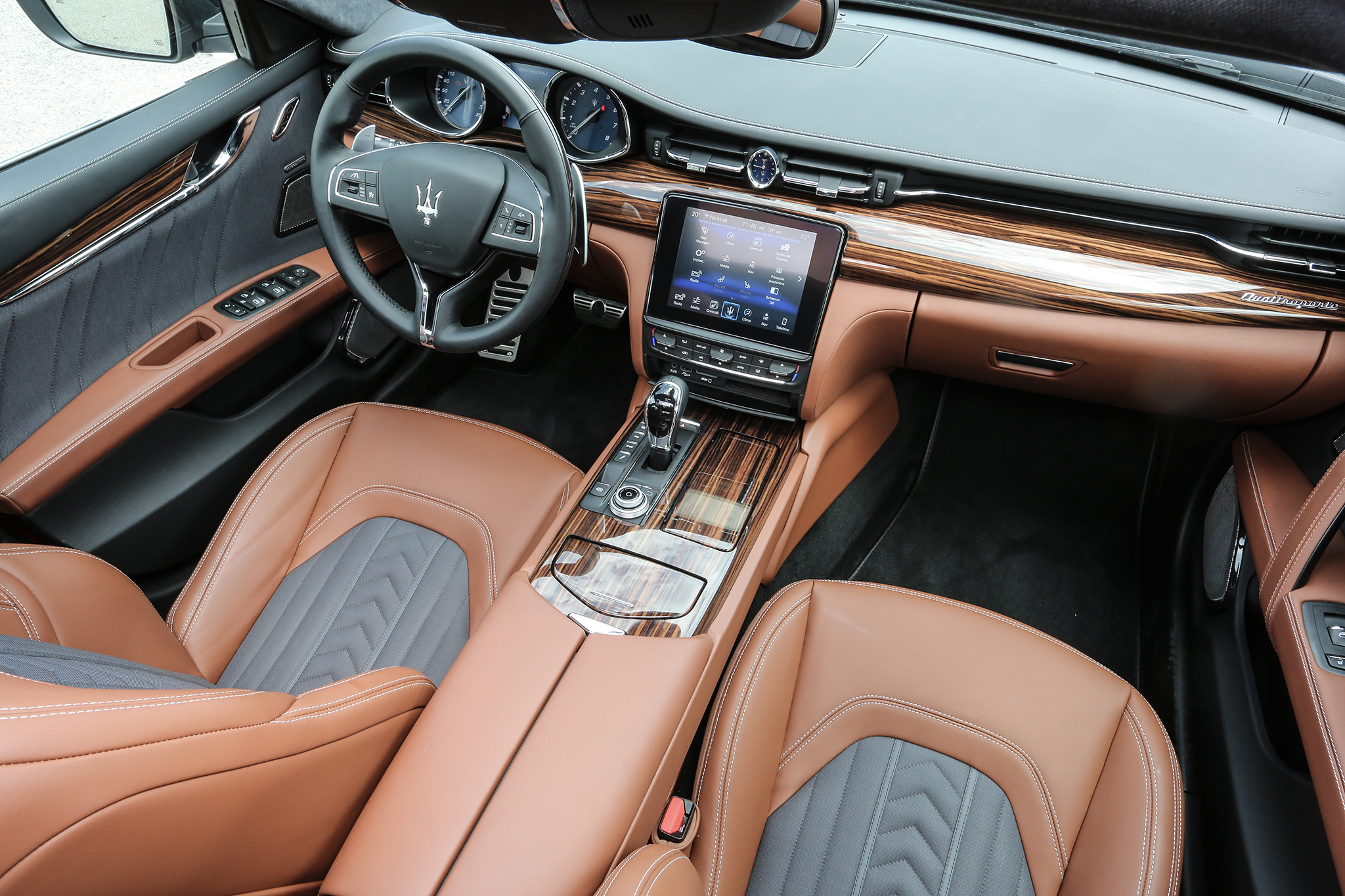 First, open one of those quattro portes: If you're expecting a direct descendant to an opulent 1960s-era Maser, the Quattroporte GranSport's interior, though admittedly pleasant and premium in spots, might leave you a little empty in its somberness. Step up to the GranLusso, and there are cleverly elegant little details, particularly in the silk accents and rich wood, which add a sense of occasion. But, as fashion-forward Italian design goes, the Q-Porte doesn't push boundaries particularly hard, or wow with outlandish themes. And yes, if you look closely, you might detect a whiff of Chrysler-ness in certain nooks, such as the the plasticky door handles, mundane window switches, and shiny surround trim.
