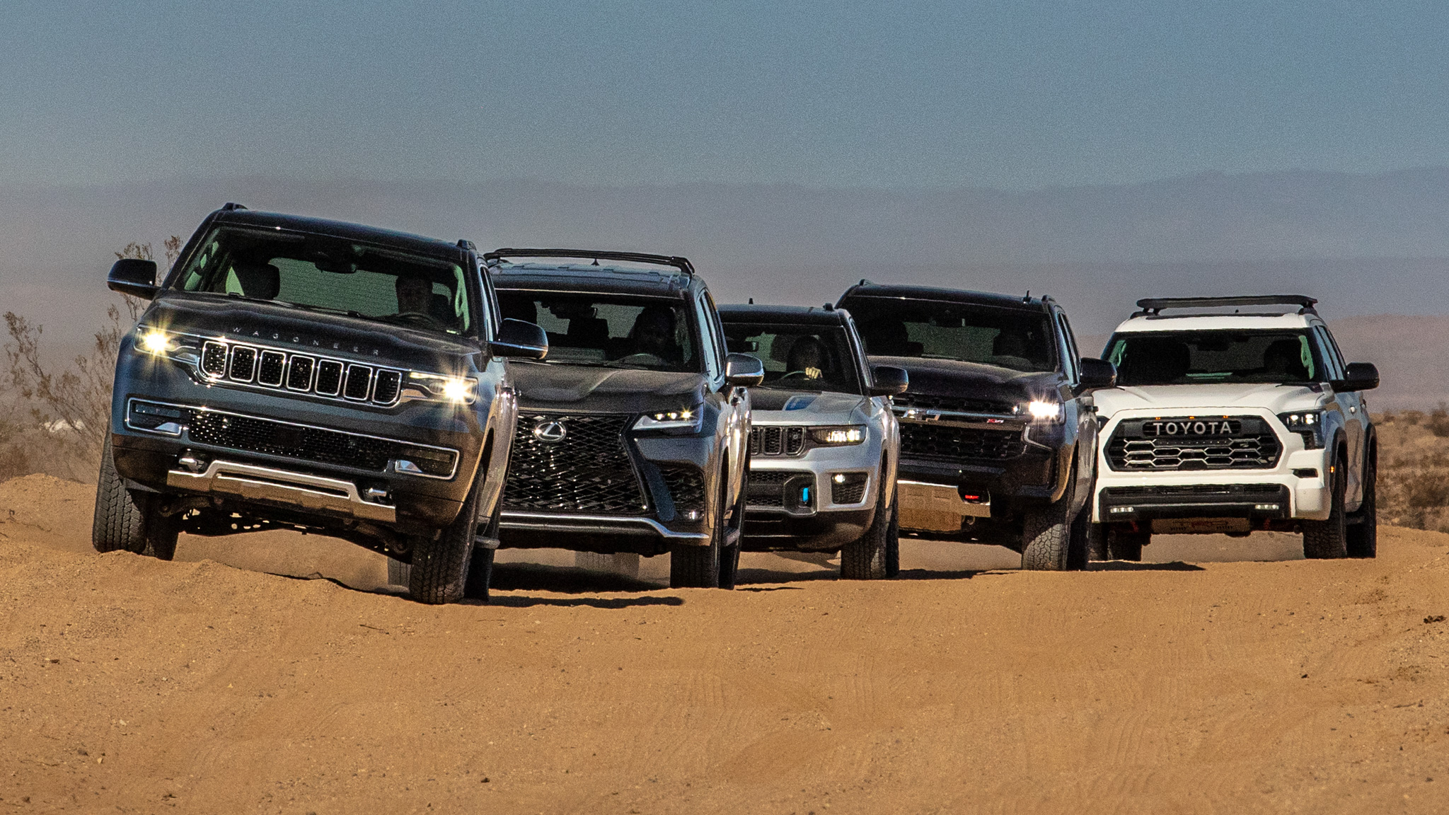 With the track testing complete, it was time to get dirty. This year's test saw a wide variety of off-road terrain. We found plenty of rocky trails high up in the mountains, drove through groves of Joshua Trees, traversed rutted hill-climbs in the Mojave Desert, blasted through miles upon miles of desert sand washes, found ourselves on icy shelf roads, and played in muddy puddles. This large variety of terrain allowed our judges the opportunity to test all the off-road functions of the vehicles, from four-wheel-drive engagement and traction devices to tire grip and ground clearance.