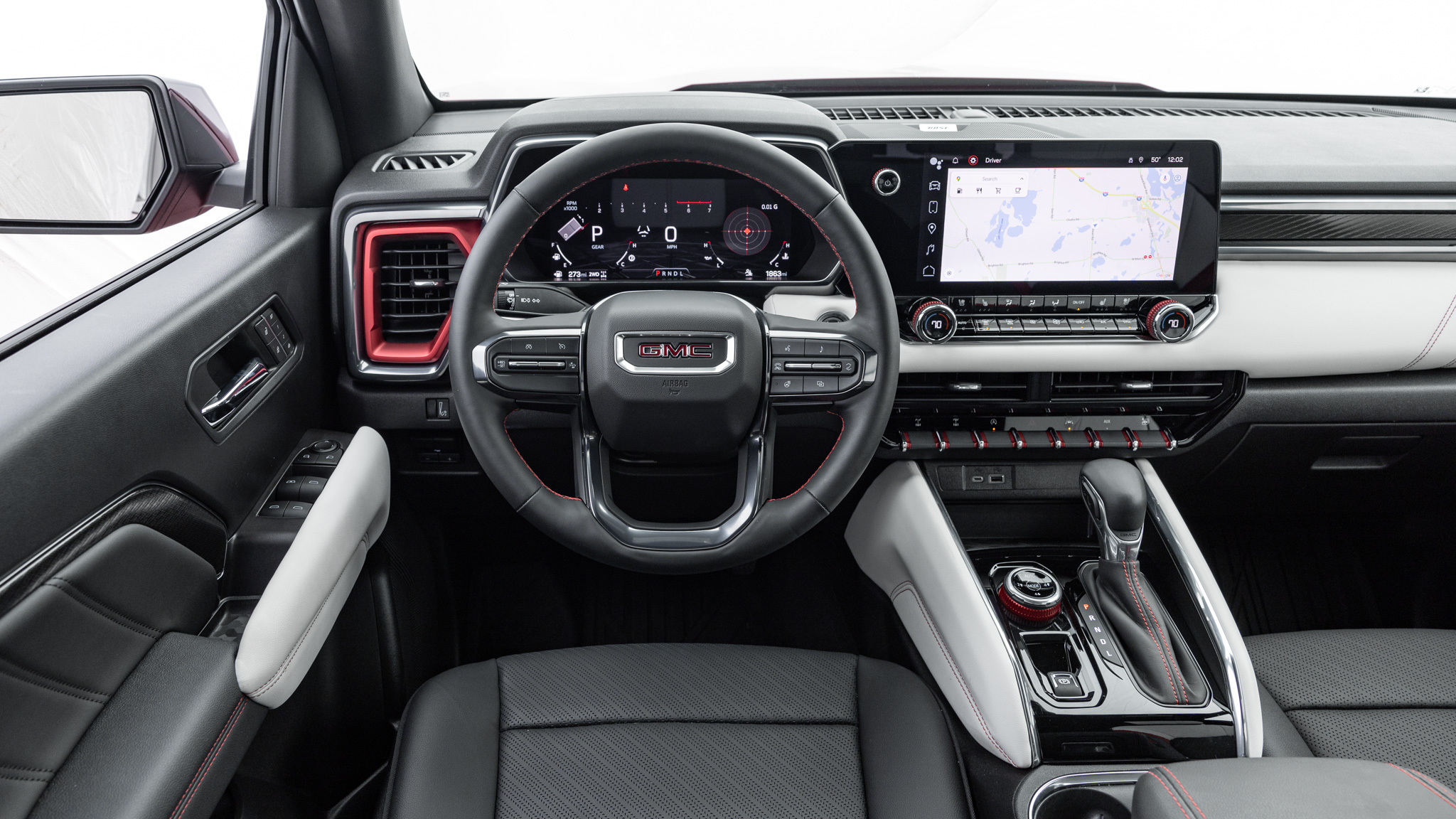 Compared to the previous generation of GMC Canyon trucks, the new interior layout is far superior. White with red accents grabs your attention from a distance, though our test drivers were seen frowning over how easily the surfaces attracted grime from soiled gloves and boots. Maybe the snow-sport-inspired trim is better suited for alpine conditions with more powder and less crud? Nevertheless, editors fancied the deep colors and abundant tech readouts on the 11.0-inch digital dash and 11.3-inch center screen. Universal grumbles were heard over needing to dip into touchscreen menus to access traction control and to change headlamp settings. More than one of us would trade the "all-four-windows-down" flipper for a traction control switch.