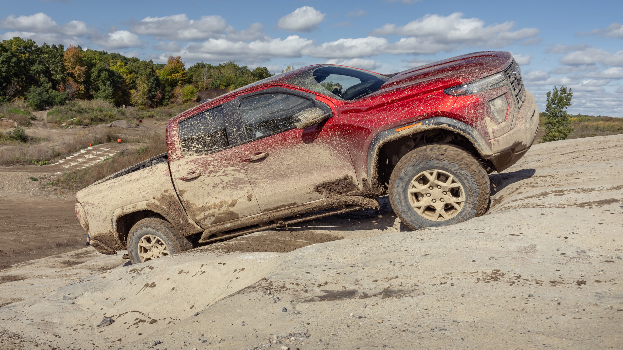 Opting for AT4X gives you the widest (66.3-inch) track width of the Canyons. Pulling the front axle forward also gave the Canyon AT4X a 36.9-degree approach angle and 25.0-degree departure angle. Minor differences in bodywork give the Colorado ZR2 slightly more aggressive approach/departure angles (38.3 and 25.1). Ground clearance of 10.7 inches is shared between Colorado ZR2 and Canyon AT4X. When the distance between truck and obstacle closes to zero, the AT4X is ready with armor covering all vulnerable parts (all of which the ZR2 also has). Our front bash plate rubbed noses with a few rocks and shrugged off blows from dirt hummocks with ease while the purebred steel rocksliders helped pivot the truck around some tighter bits of trail. In the armor department, only the Jeep Gladiator can be ordered with similar amounts of protection.