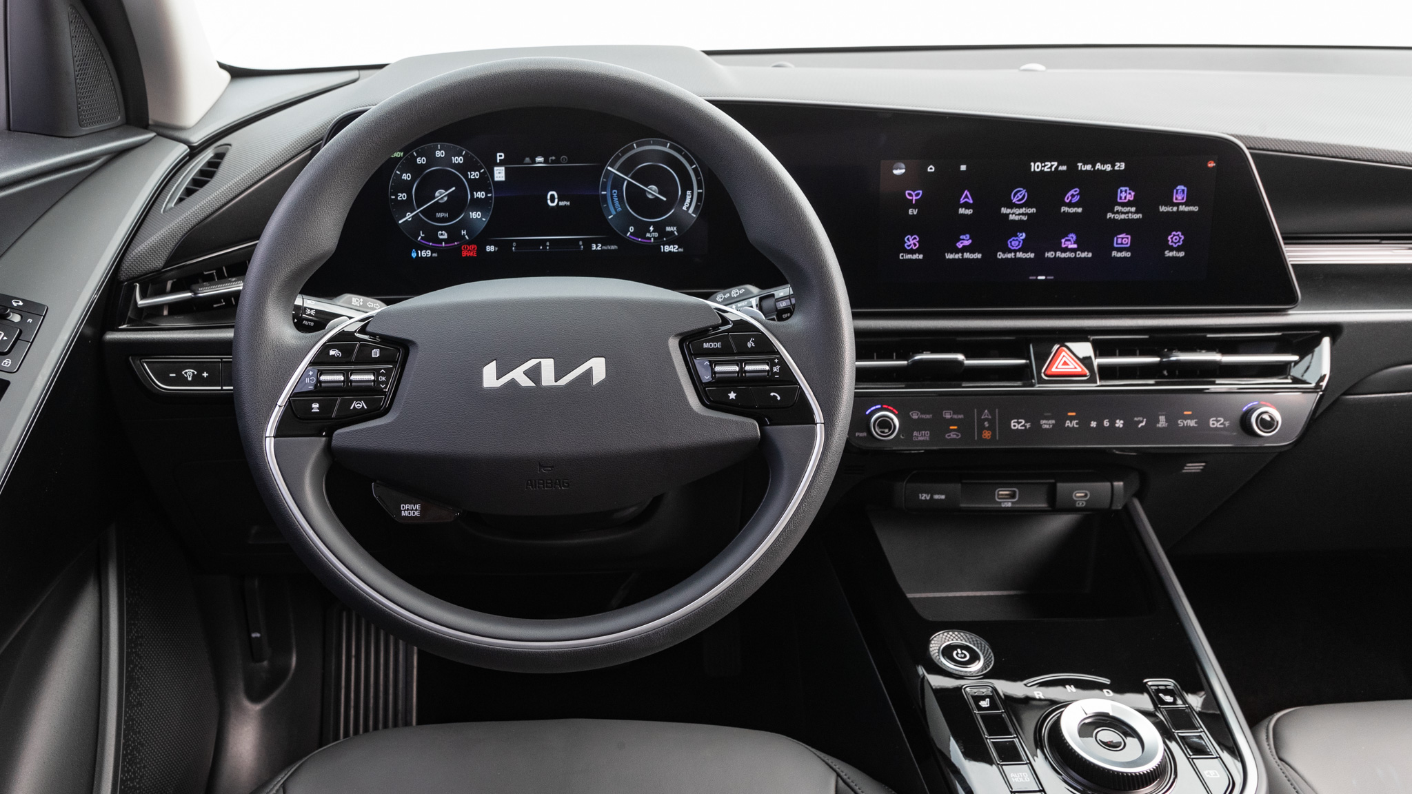 The old Niro's economy car roots were obvious, with cheapness that you could see and feel throughout the interior. The 2023 model is stylish and modern enough to hide any evidence of cost cutting. It's not that the materials are necessarily nicer in the new Niro. You can still find plenty of hard plastics. The design of the cockpit and the finishes of those plastics, though, keep your attention from ever focusing on them.