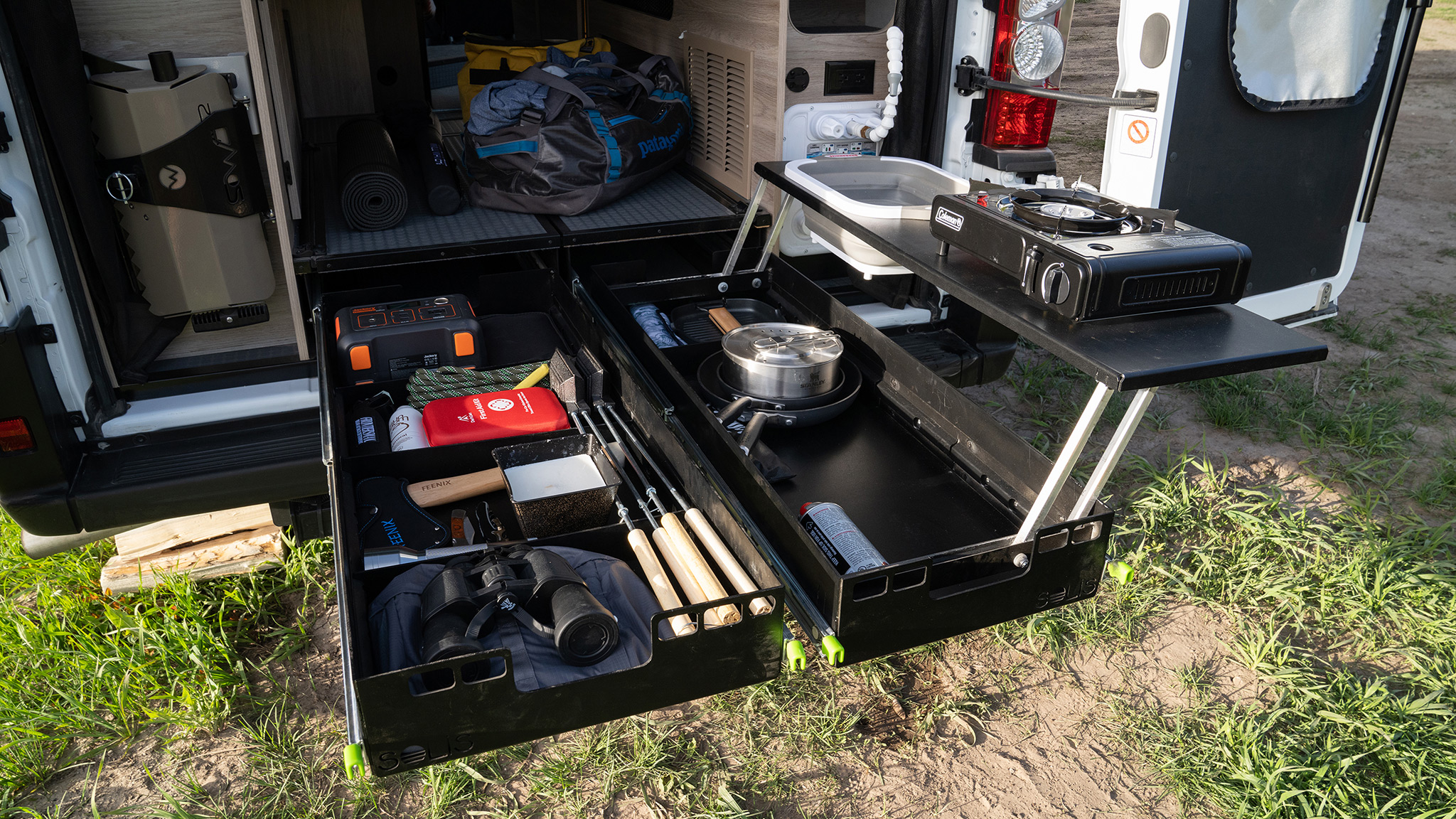 Camper van’s special drawer system doubles as an outdoor cooking station.