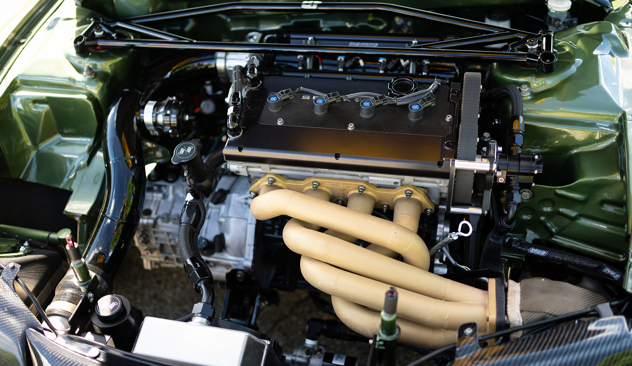 The driveline had remained problematic for even longer, but finally seems rock-solid today with a Tim Zimmer-built factory H-pattern manual transmission, transfer case, and 3000GT rear diff loaded with PPG straight-cut dog-engagement gears (trans) and a Magnus DSM gearset (transfer case and rear diff). Custom Drive Shaft Shop axles and a Quarter Master triple-plate clutch transfer power to the classic Volk Racing TE37 wheels and Mickey Thompson slicks.