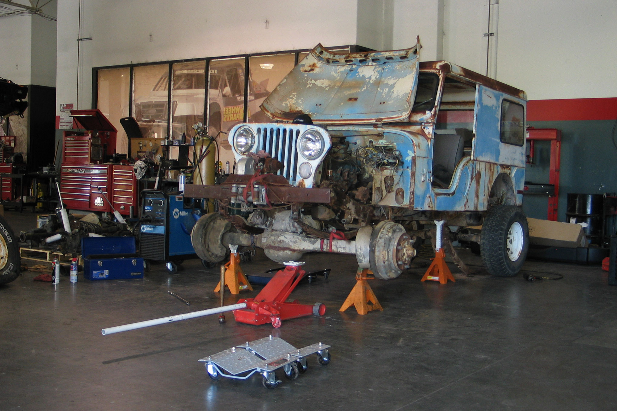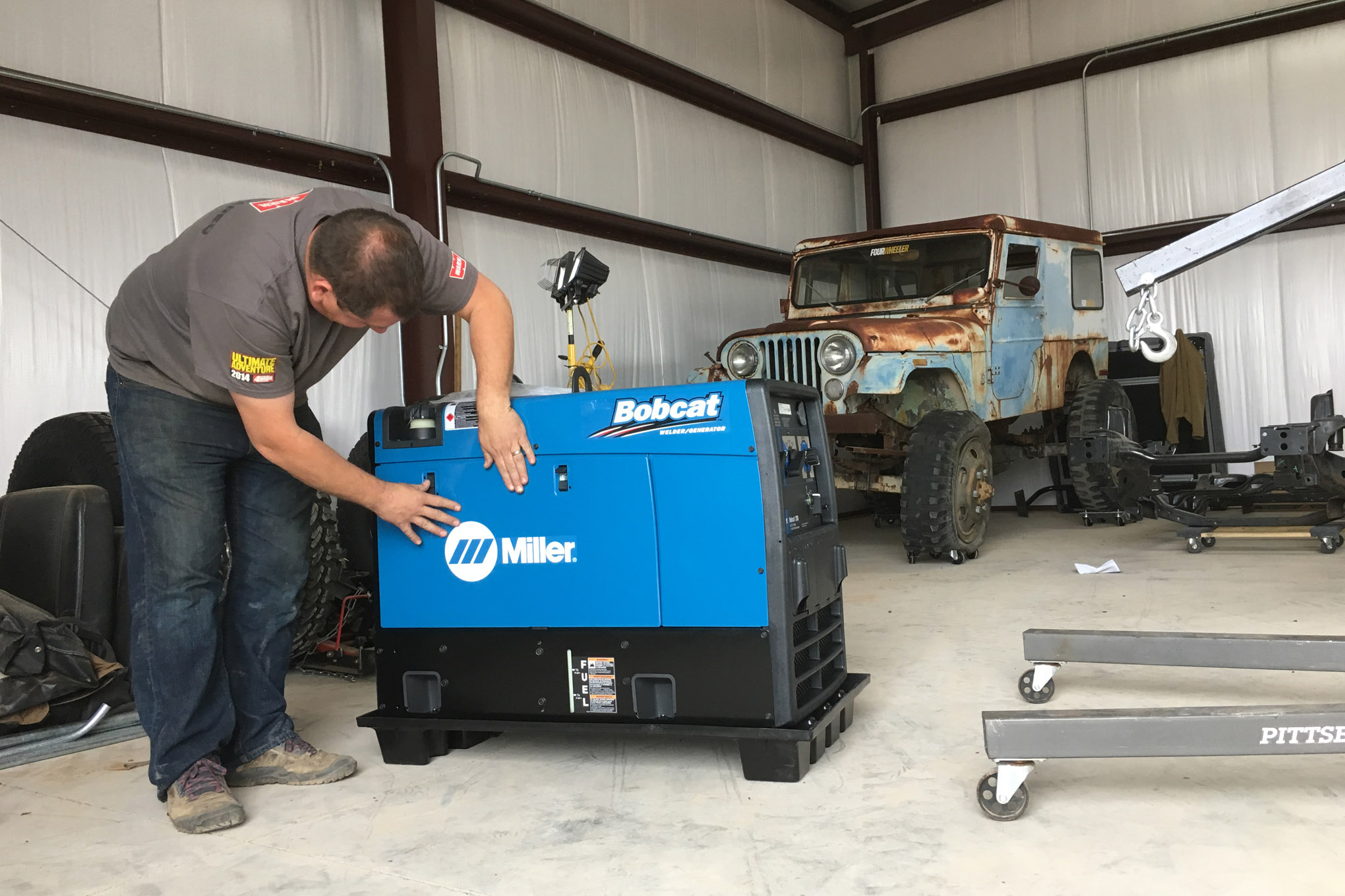 The rest of the parts and pieces will fall into place hopefully rather quickly after we get the rolling chassis assembled by next installment. Simons’ brand new shop doesn’t have the electricity hooked up yet, so in order to get this build under way we borrowed a Miller Bobcat 250 welder/generator system from our friends at Miller Electric.
