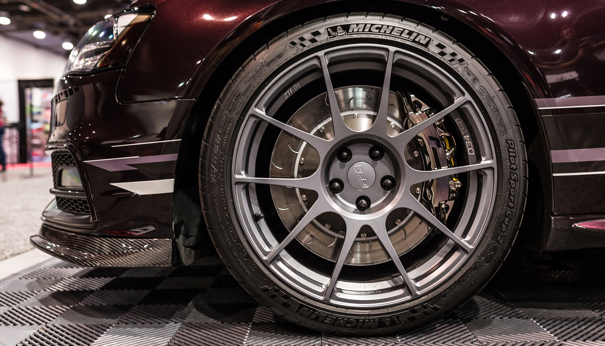 The group also offers their own wheel line, and their ZTF-01 forged model in 19x9.3 +35 was chosen for this build and set inside of Michelin Pilot Sport Cup 2 tires. The matte anthracite finish works nicely with the unique body color and these wheels were developed specifically to maximize tire fitment without having to resort to fender rolling.