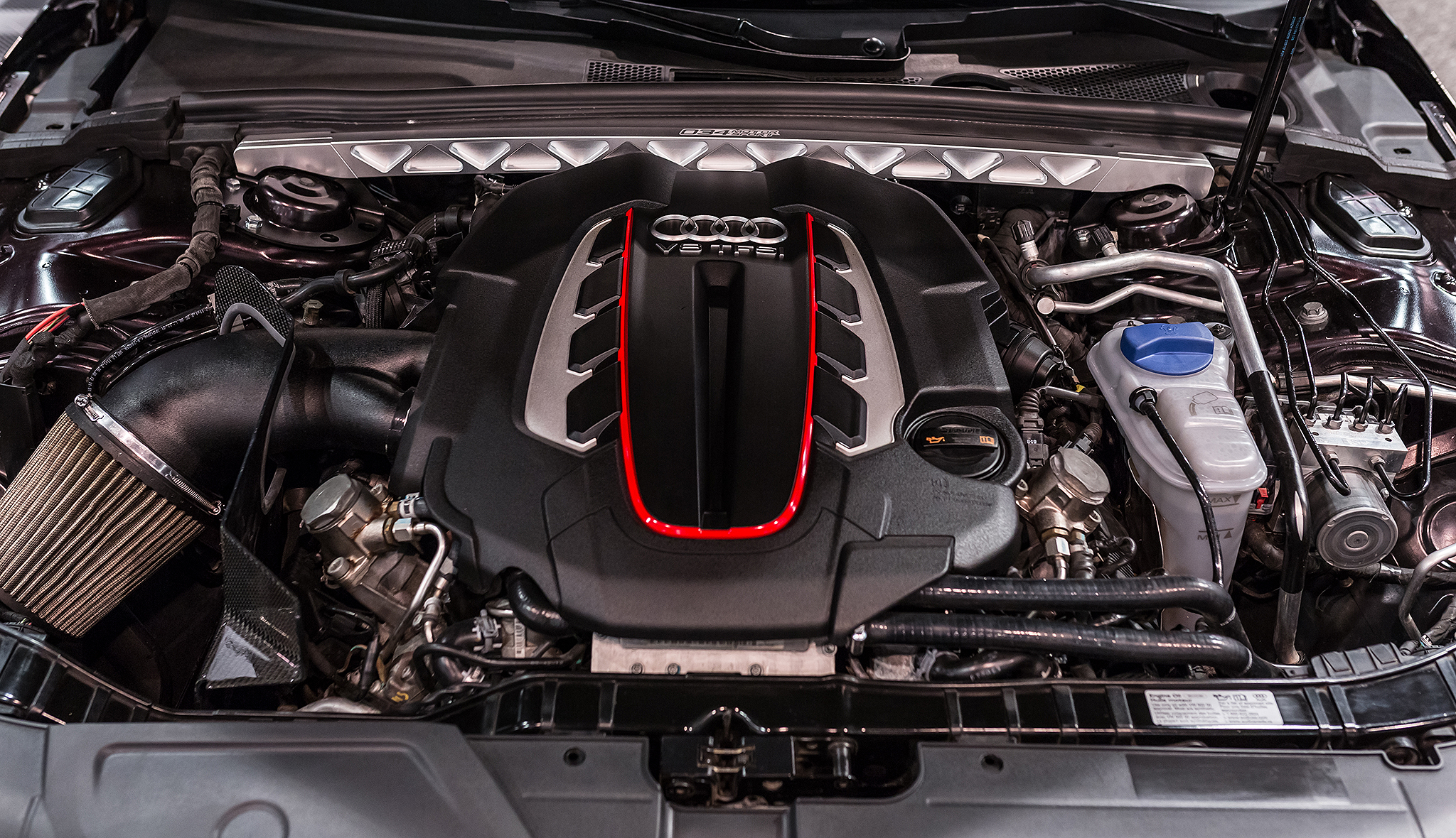 If you know your Audi's then the V-8 engine cover gives things away, but if you're not well-versed you'd assume a few bolt-ons were added and all is fairly stock based on fitment, the level of workmanship, and the full use of factory ancillary parts. What you can spot is 034's open-element intake with carbon fiber heat shield and behind the engine itself sits a beefy billet aluminum shock tower brace.