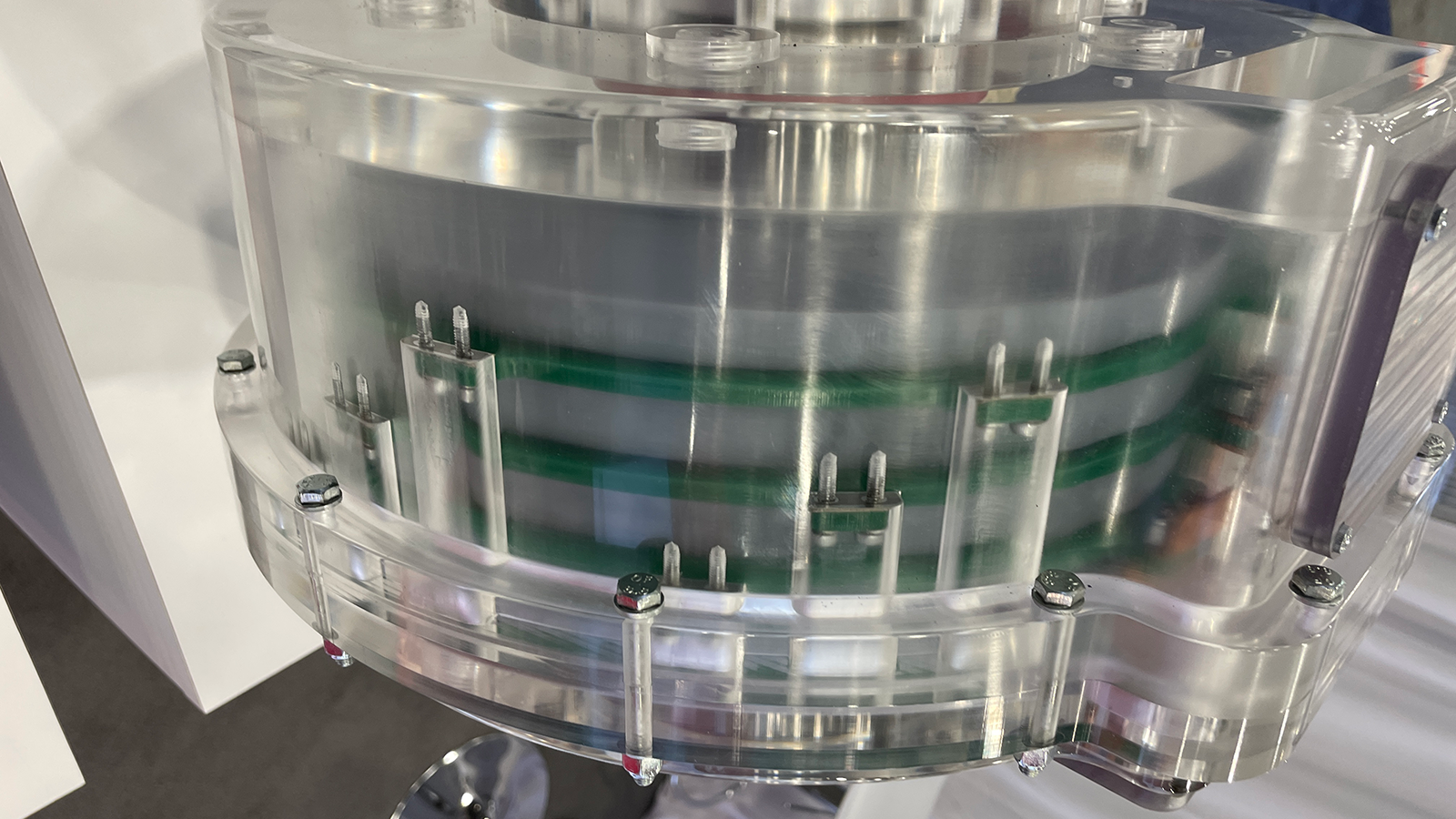 The initial motor shown at CES features three printed-circuit stators sandwiched by four permanent-magnet disc rotors, and is wound for three-phase operation. Cooling oil enters under pressure through the output shaft, flowing axially out to directly cool the copper traces before collecting in a sump at the bottom. As shown, it's rated for 201 hp continuous, 402 hp peak—and note that superior cooling potentially allows it to sustain peak power longer than other designs could.