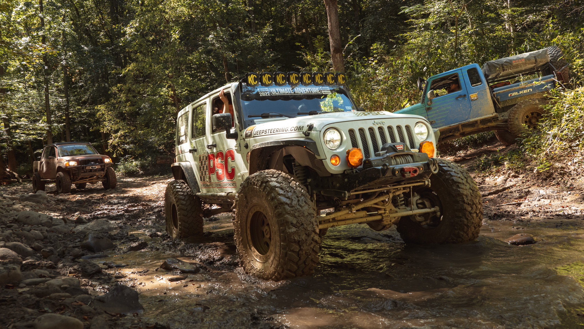 Off roading is hard on parts, especially when you add in big tires that are aired down, horsepower a plenty and locking differentials. This is particularly hard on a vehicle's steering system which has to fight not only the trail, but also these large aired down tires and lockers. Luckily for us, PSC is the Official Steering of Ultimate Adventure for 2022. That's more than just a lucky coincidence because we have been using PSC power steering parts for decades during the Ultimate Adventure and their parts always help direct the vehicle on which they are mounted. Tom and Josh Allen from PSC joined us last year in Oklahoma and Texas and continued the trend following Ultimate Adventure to Alabama, North Carolina, Georgia, and Tennessee for UA 2022. Tom and Josh drove their LS3 powered JK Unlimited which lost a rear locker and a ring and pinion the first day. From there they went on an alternate adventure, driving in front wheel drive until they could gather the parts to re-built the rear axle and caught the group on day 4 prior to an awesome day at Windrock park and survived the rest of the UA with hardly a bump.