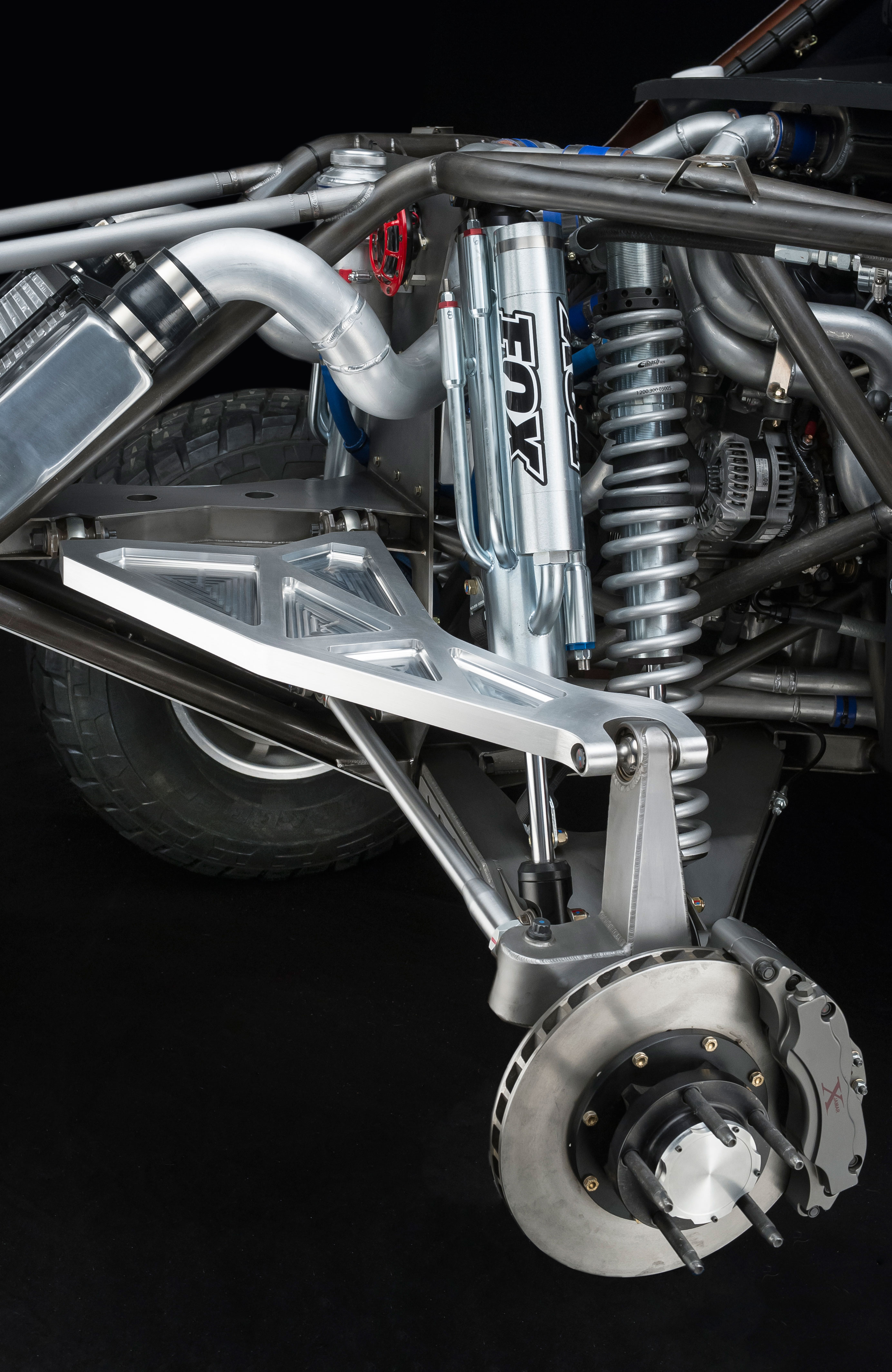 Huge TNC Machine trailing arms suspend the Currie Enterprises 4130 F9 TT rearend. Fabricated with 4-inch tubes, the rearend features Currie Enterprises 45 spline, 300mm gun-drilled axles, a Currie Enterprises 2.5-inch desert race hub kit, and McCarthy says that the gear ratio is “classified.” We didn’t want to get killed, so we didn’t ask again. The rear brakes consist of Jamar calipers with Hawk pads that clamp onto 14-inch rotors.