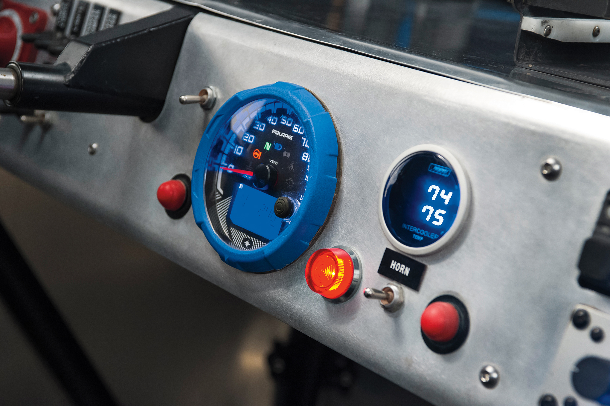 The custom, Jagged X Racing-made aluminum dash houses both the stock Polaris gauge as well as various switches, lights and buttons.