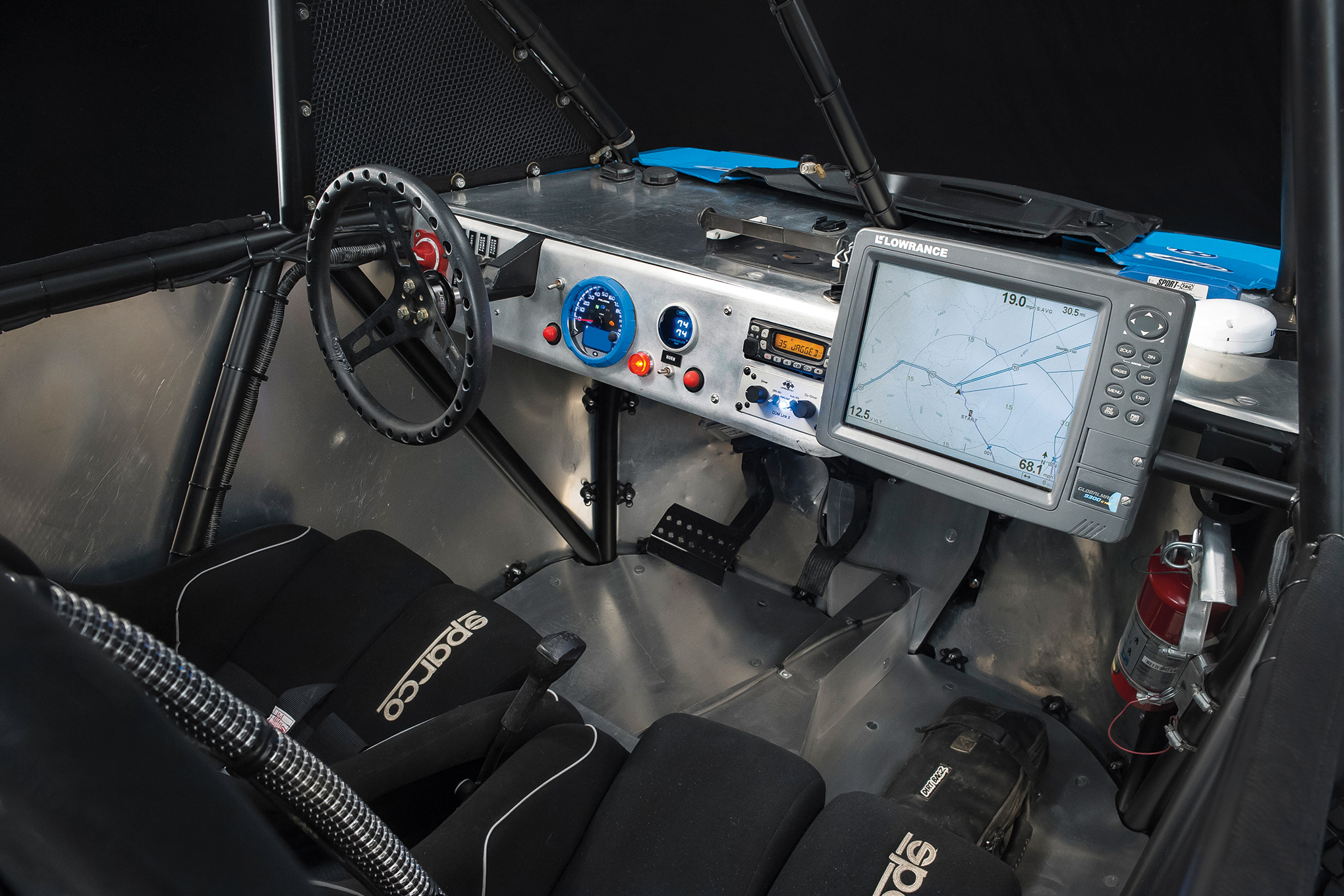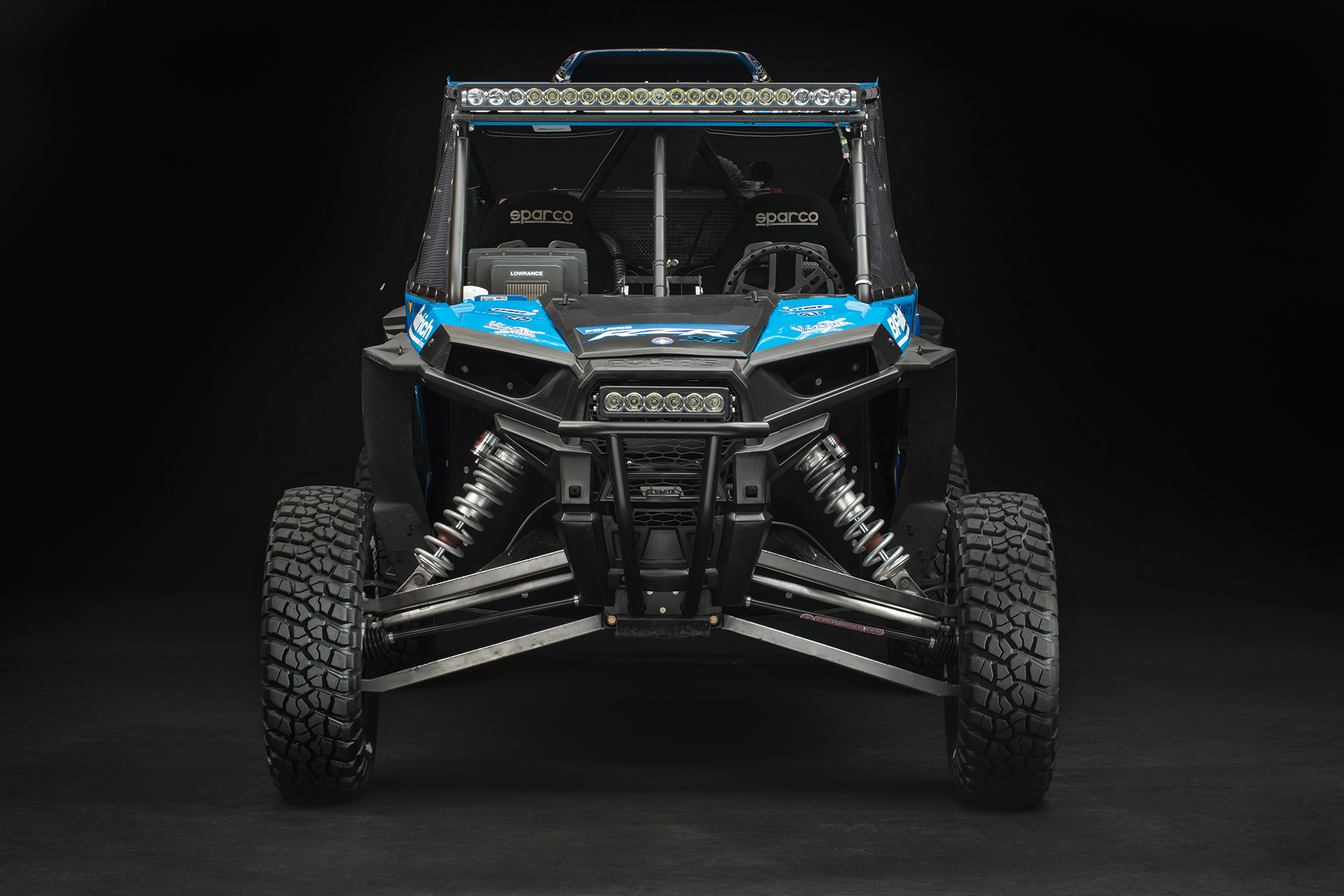 Inside is all the pieces that one would expect from a racecar: Sparco Evo II seats with Simpson 3-inch, 5-point harnesses, a Joe’s aluminum steering wheel, a PCI Race Radios Elite intercom & Icom system and a huge Lowrance GPS unit. Many parts, such as the shifter and gauges are stock Polaris units, but the gauge sits in a custom aluminum dash that Jagged X fabricated. They also modified the stock wiring harness to cleanly include all of the many additional electrical pieces, such as the PCI Dual Air fresh air system.