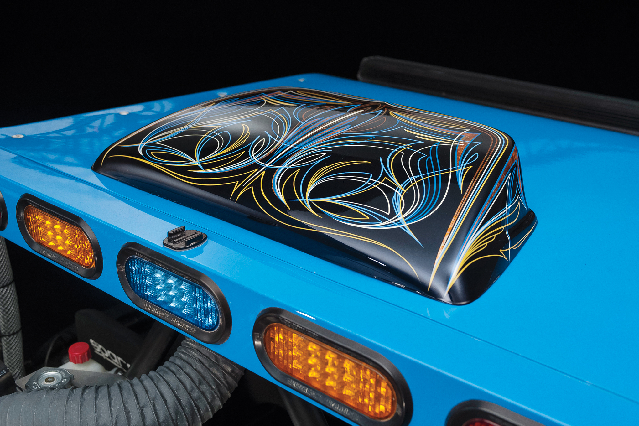 Vision X Lighting is used as their 40-inch XPR LED light bar is placed above while a 12-inch XPR LED bar has been installed into the bumper. The required LED safety lights are placed into a box at the rear of the top and a small KC HiLites LED unit also faces to the rear.