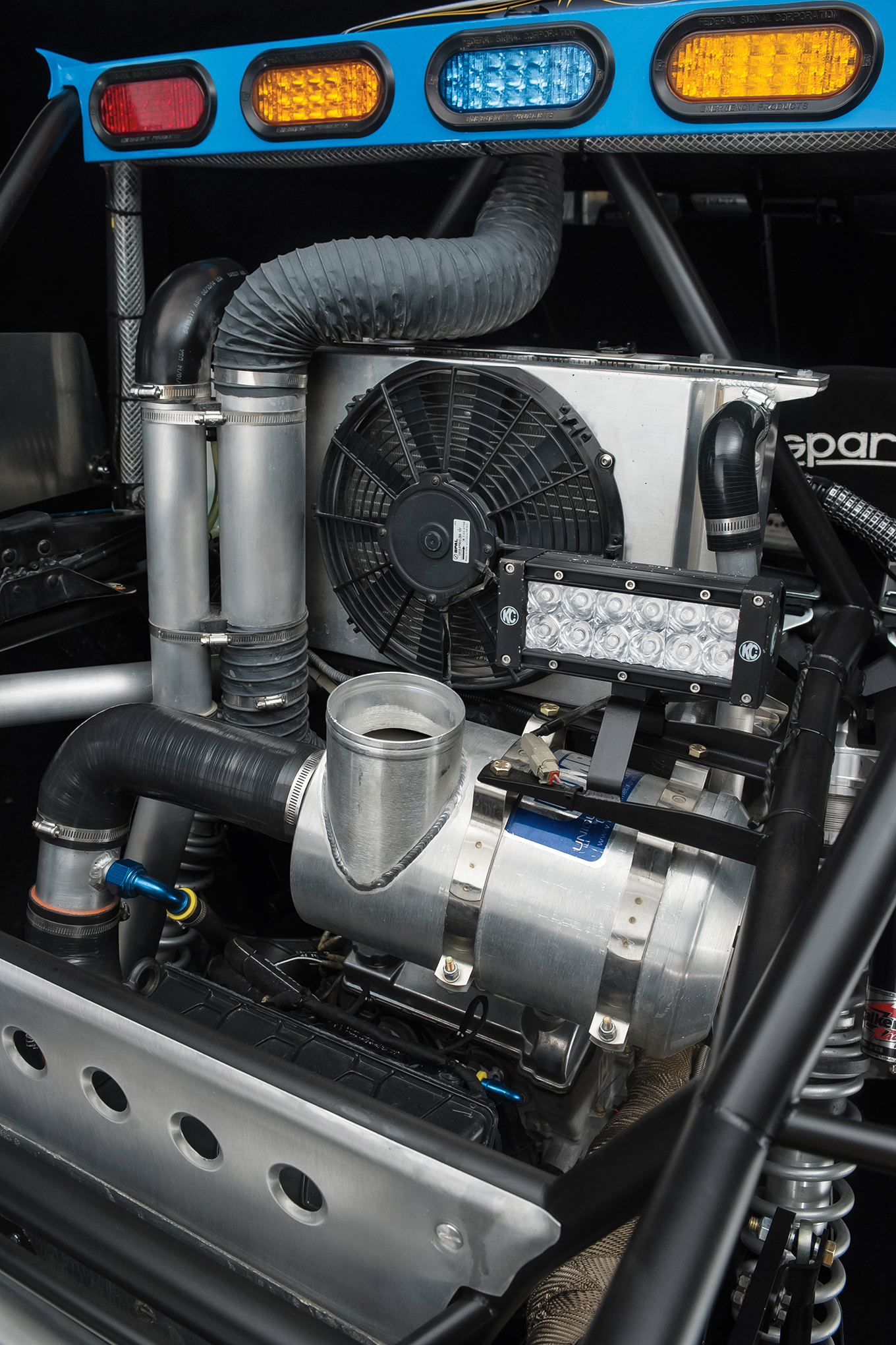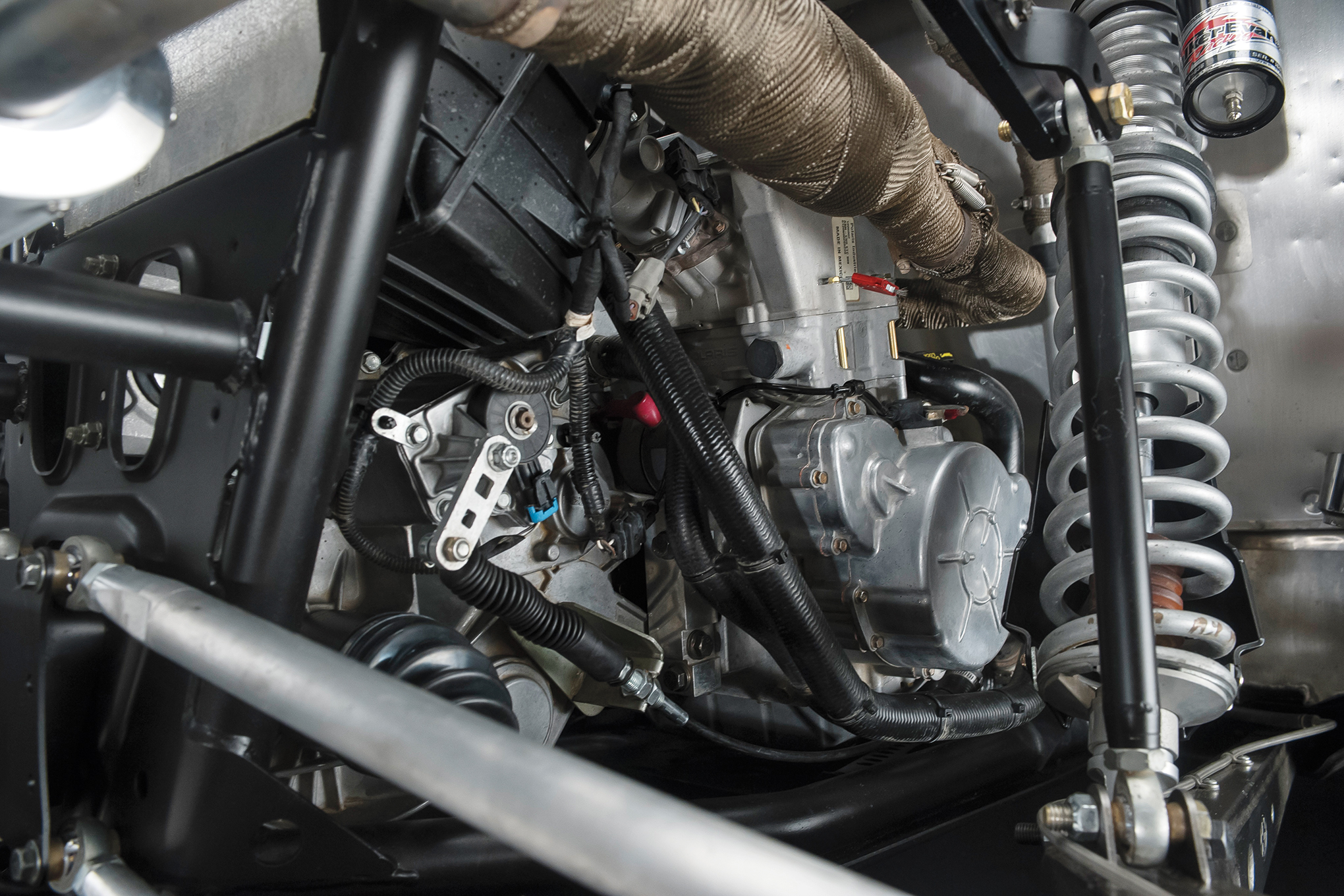 A UMP air cleaner canister utilizes a Donaldson paper element while the SPAL fan equipped Ron Davis radiator keeps the RZR cool.