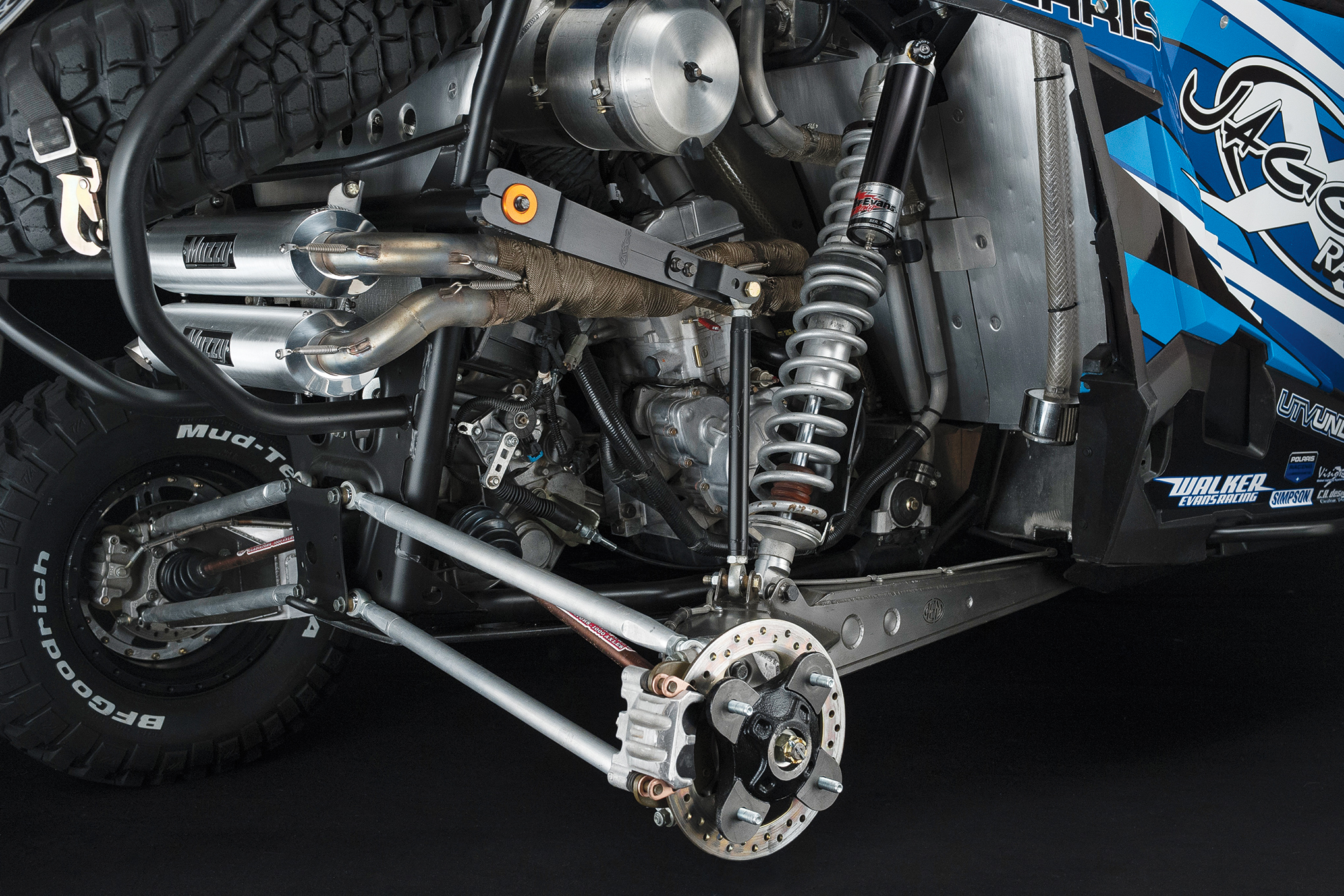 Another rule is that the stock suspension mounting points remain, so the Jagged X front control arms are 2-inches longer and wider than the stock Polaris units and were designed in association with Cutting Edge Manufacturing in Phoenix using solid works CAD and precision laser cutting and forming. The front spindles are also a collaborative effort between Jagged X and Cutting Edge while stock RZR brakes are used. The front shocks are Walker Evans 2.5 custom Needle Valve single coil overs that have been equipped with Eibach springs.