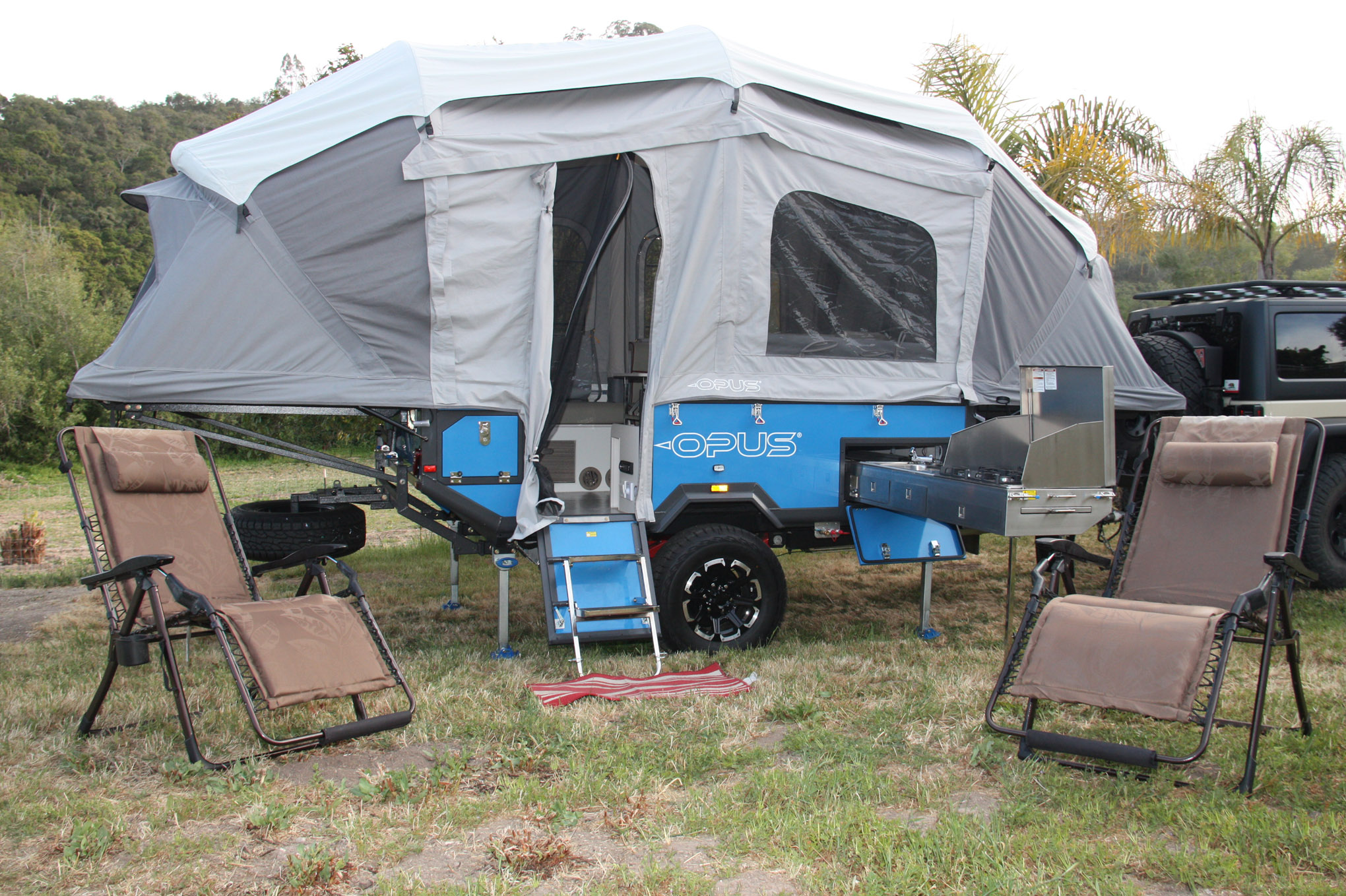 The curb weight of the AIR OPUS Camper comes in at only 2,780 pounds, including the tent, and has an additional 1,100 pounds of cargo capacity. Even loaded for bear, the trailer doesn’t tend to push the tow rig around like heavier camping trailers would. Its low center of gravity is the main reason for that surefootedness, and it helps keep the tires planted in off-camber situations. The AIR OPUS Camper is the Swiss Army knife of off-road campers.