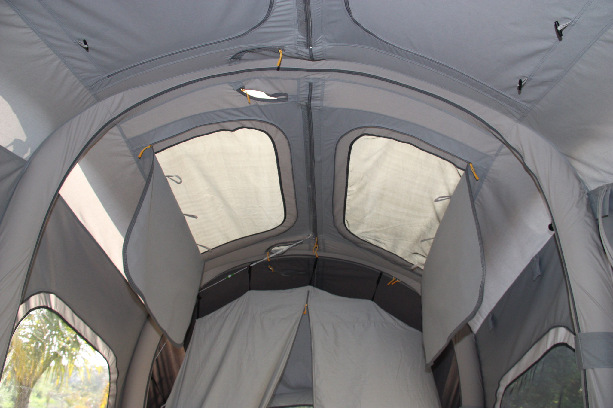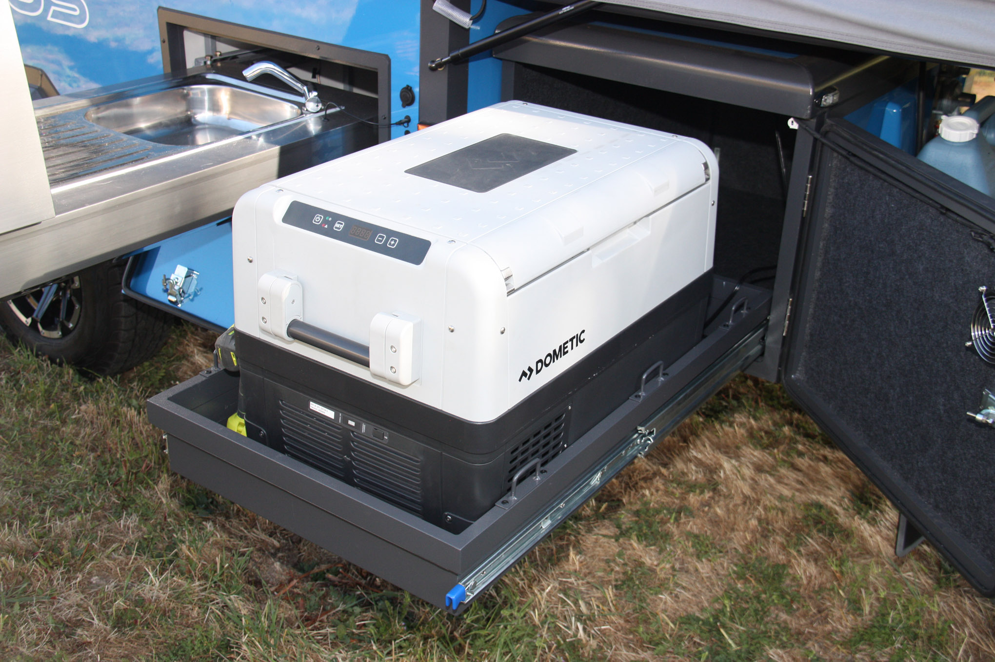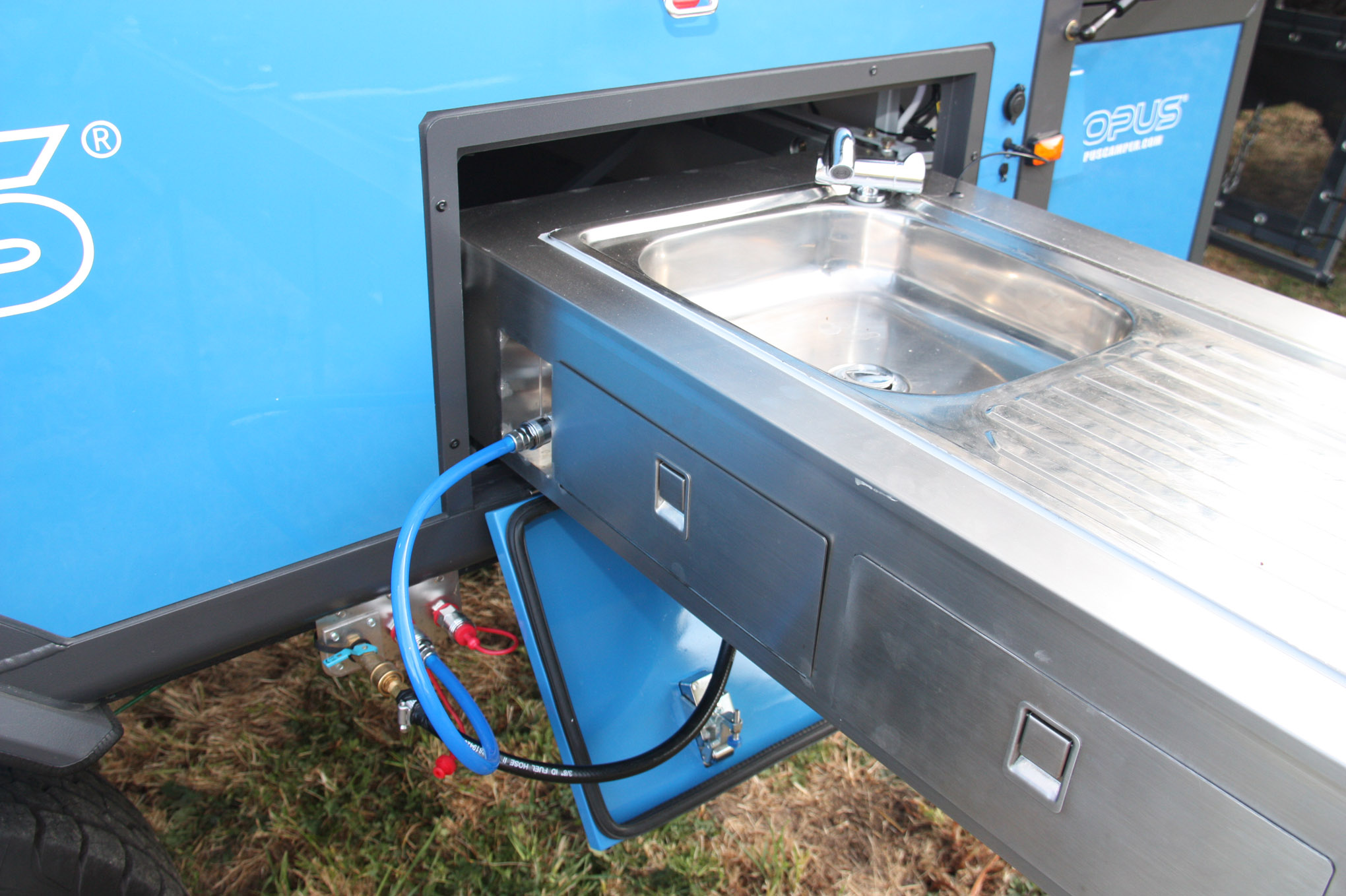 Setting up the AIR OPUS is a straightforward multistep process: Set the hand brake, unfold and secure the two lids (beds), close the air valves, tighten four corner straps, and then turn on the air pump. In fewer than five minutes camp is set up. When it’s time for dinner, just slide out the outdoor kitchen, which includes a wash sink with electric pump-fed faucet, four-burner gas stove, and portable refrigerator.
