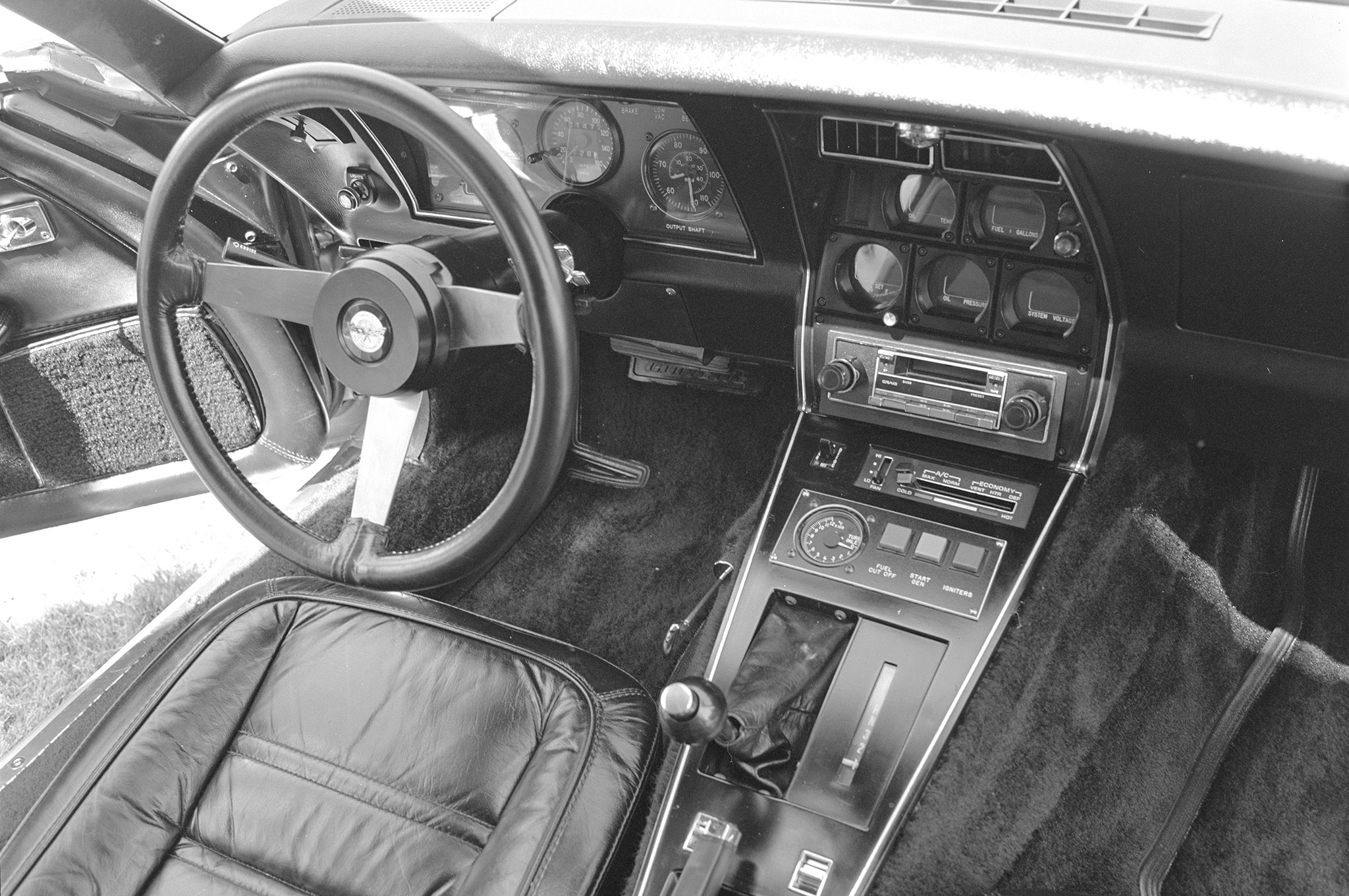 Even with the gear reduction, the Vette would accelerate to 60 mph at idle. So “massive, ventilated, NASCAR-style disc brakes” were mounted at all four corners, and keeping the Vette within urban speed limits meant riding the brake pedal. The throttle was used only on the highway and the racetrack.