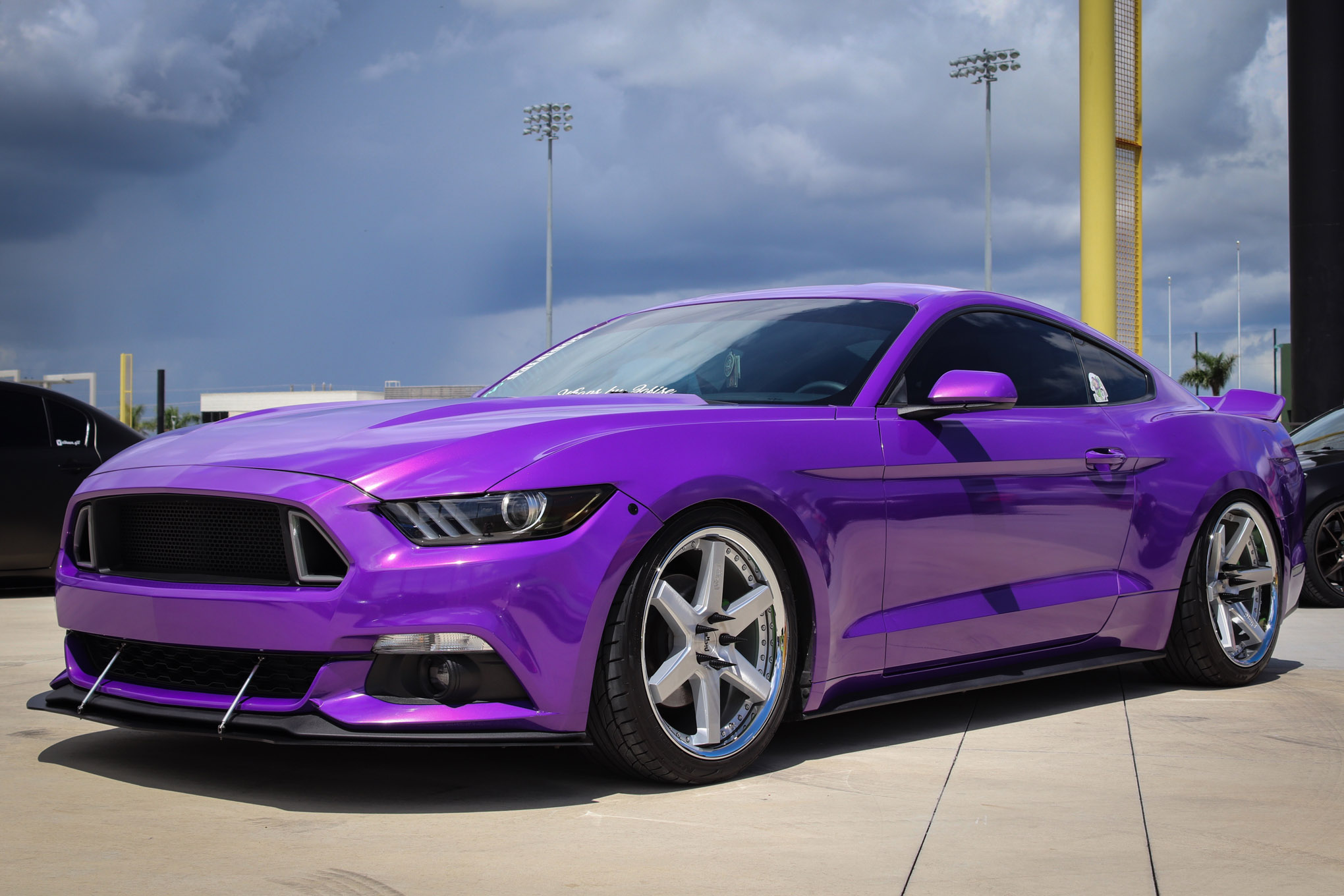 You can’t miss Lauren Tiller’s bright purple Mustang rolling around the Sunshine State. Over the past two years the 2016 EcoBoost Mustang (which is actually Deep Impact Blue) has undergone quite the aesthetic transformation, including the 3M wrap in Gloss Plum Explosion that Lauren and her boyfriend installed. Although Lauren named the car Stacy, most people know it now as The Grape. Other mods include Niche Altair M193 wheels wrapped with Nitto N/T555 G2 rubber, True Spike lug nuts (black, green, and purple), a real RTR grille with LEDs, an MMD V Series spoiler, a roof spoiler, a California Pony Cars front splitter with rods, and lime green-painted calipers. The reverse light, switchback turn signals, smoked side markers, and interior LED lighting are all from Diode Dynamics. Performance additions include a Roush Performance axle-back exhaust and cold air kit. Handling is provided by BC Racing Extreme Low BR type coilovers. The interior also stands out with the dash wrapped in Hexis Gloss Kiwi Green.