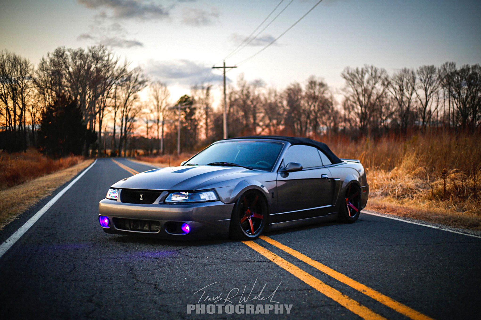 Chris Tress from Marietta, Georgia, owns this unique 2003 SVT Cobra sitting pretty with the Air Lift Performance 3P air ride suspension, Strange 10-way adjustable rear shocks, Steeda X2 ball joints, Delrin IRS bushings, and Maximum Motorsports Lo-Profile IRS bolts. Sitting atop the mill is a Posi-Ported blower with 2.76 Billetflow pulley, idlers, and snub idler. Other performance modifications include a JLT High Boost intake, Ford Performance 60-lb/hr injectors, an Accufab throttle-body and plenum, an Edelbrock hi-flow water pump, a GT500 intercooler pump, an AFCO dual-pass heat exchanger, a Ford Racing Aluminator timing set, Boundary billet oil pump gears, Bronze valve guides, and an N2MB WOT box. Shifting comes from a SPEC Stage 3+ clutch and a MGW short shifter. The wheels are Rovos Durbans wrapped with Michelin Pilot Super Sports rubber. The interior features a Classic Design Concepts carbon fiber styling bar, an Auto Meter boost gauge, and LED interior lights, among other things. (Photo by Travis Welch.)