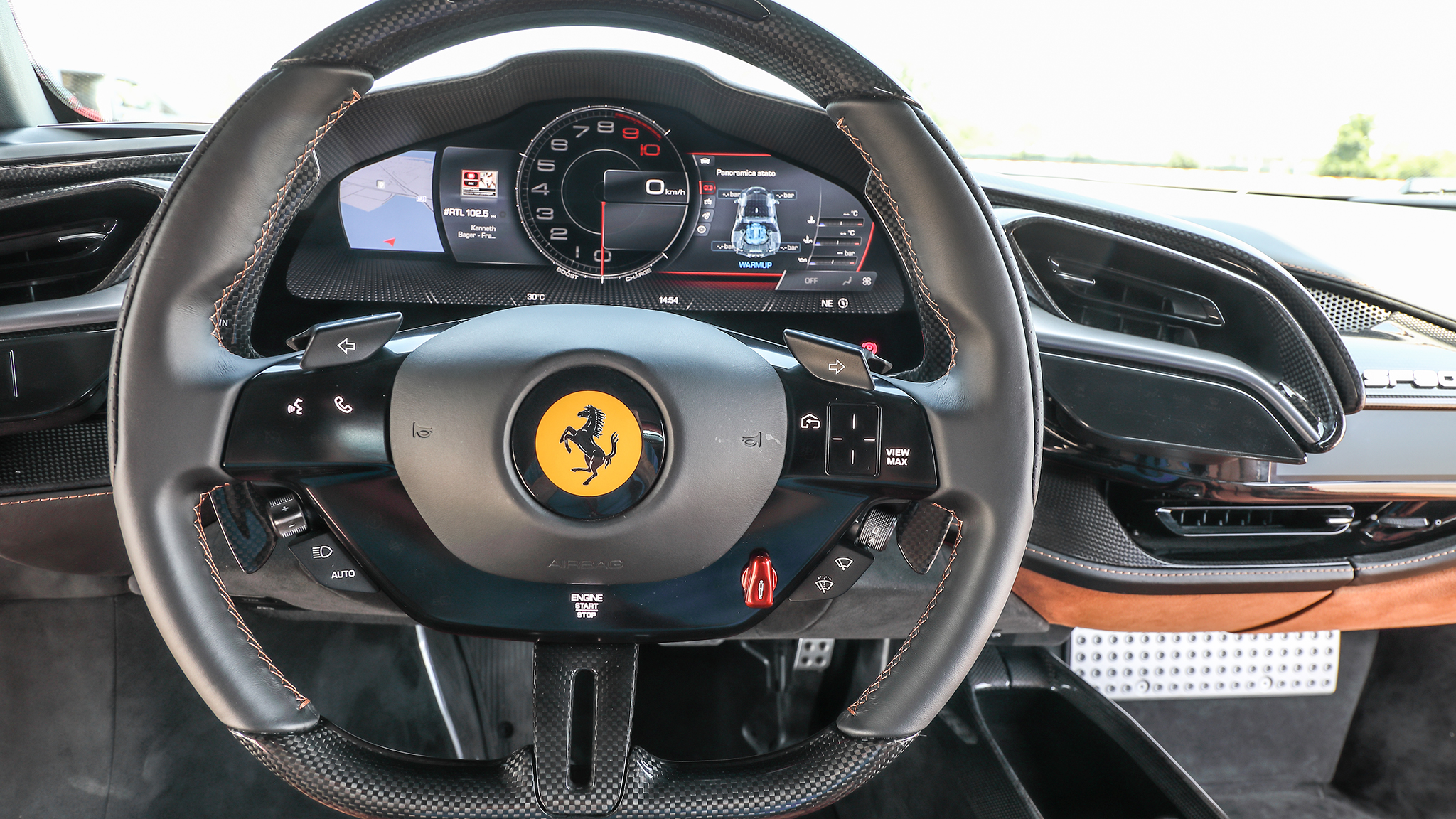 "Eyes on the road, hands on the steering wheel." That's the mantra behind the development of the new driver interface system, says Ferrari, and a new steering wheel with capacitive touch switches and a small touchpad is an integral part of the system. There is no start-stop button. Just touch the icon above the third spoke twice, and the SF90 is ready to glide away on its electric motors, with Hybrid mode being the default driving mode. Romani says that compared with an 812 Superfast, the new interface reduces the time the driver has to glance away from the road by 36 percent, and the time taken to complete a task by 26 percent.