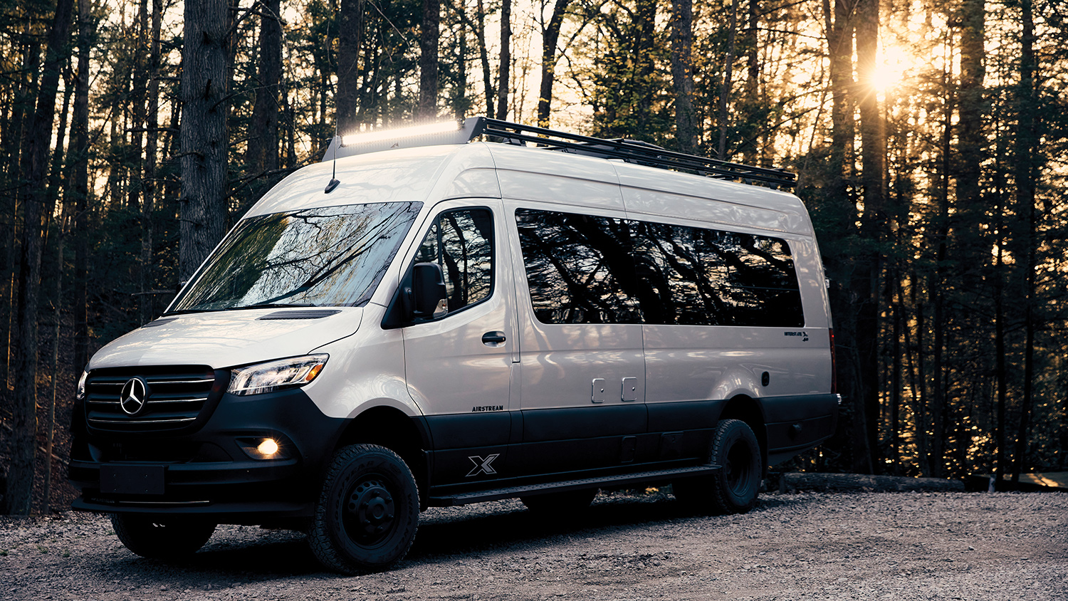 You better believe that the Iridium Silver Airstream Interstate 24X is four-wheel drive, with a two-speed transfer case and low range to boot. In addition to the four-wheel drive, the van also has air ride, six meaty LT215/85R16 all-terrain tires, and a protective coating on the wheels. There's also a protective body coating that helps defend the bumpers and side moldings from scratches and scrapes off-road. To help light the way, the Airstream Interstate 24X has a 42-inch LED light bar and additional side and rear pod LED lights. Even the powered patio awning, mounted to the roof rack, has an LED light strip.