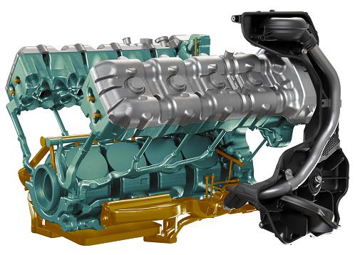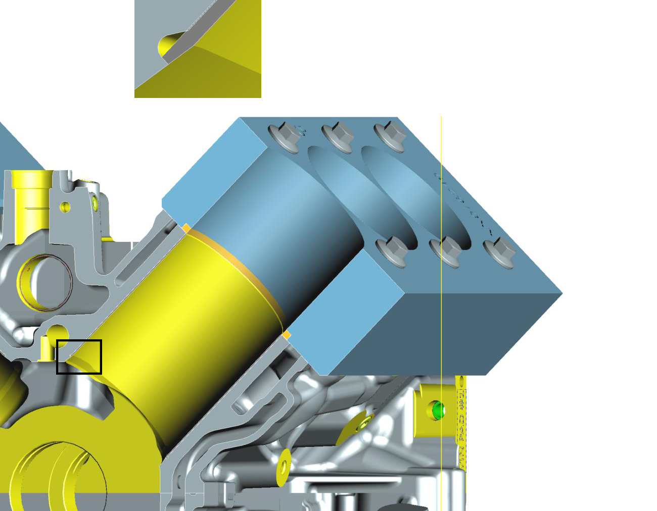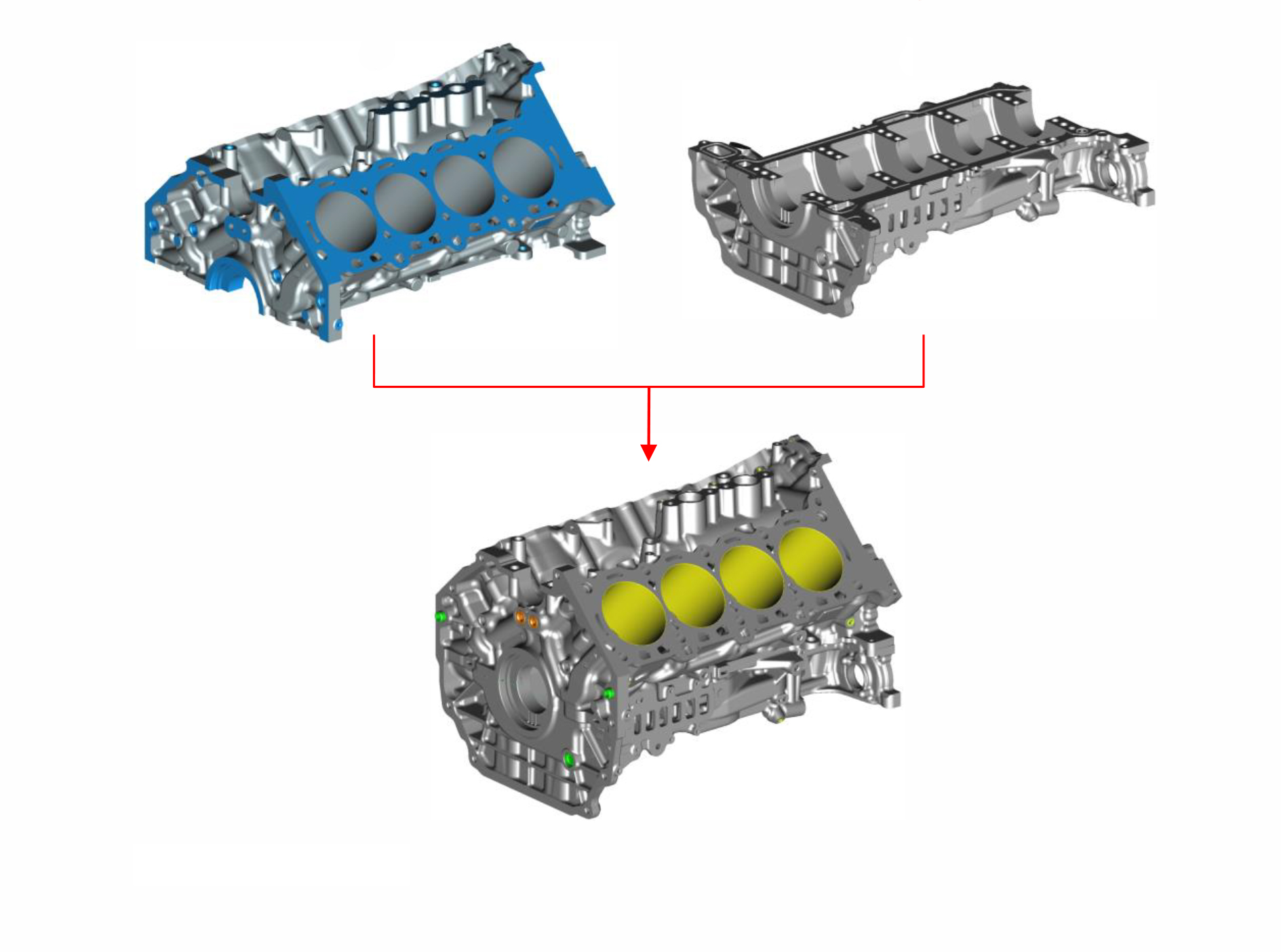 In this image, green is the Stingray's LT2 casting; yellow indicates its machined surfaces. The gray is the LT6 engine, which you can see basically fits inside the LT2. Note the LT6 cylinder bore is slightly larger while its stroke is 12 mm shorter. This plus the shorter pistons lower the deck height by 23.7 mm. Note also the two-piece LT6 block weighs 57.1 pounds less than an LT2, and that doesn't even include its oil pan.
