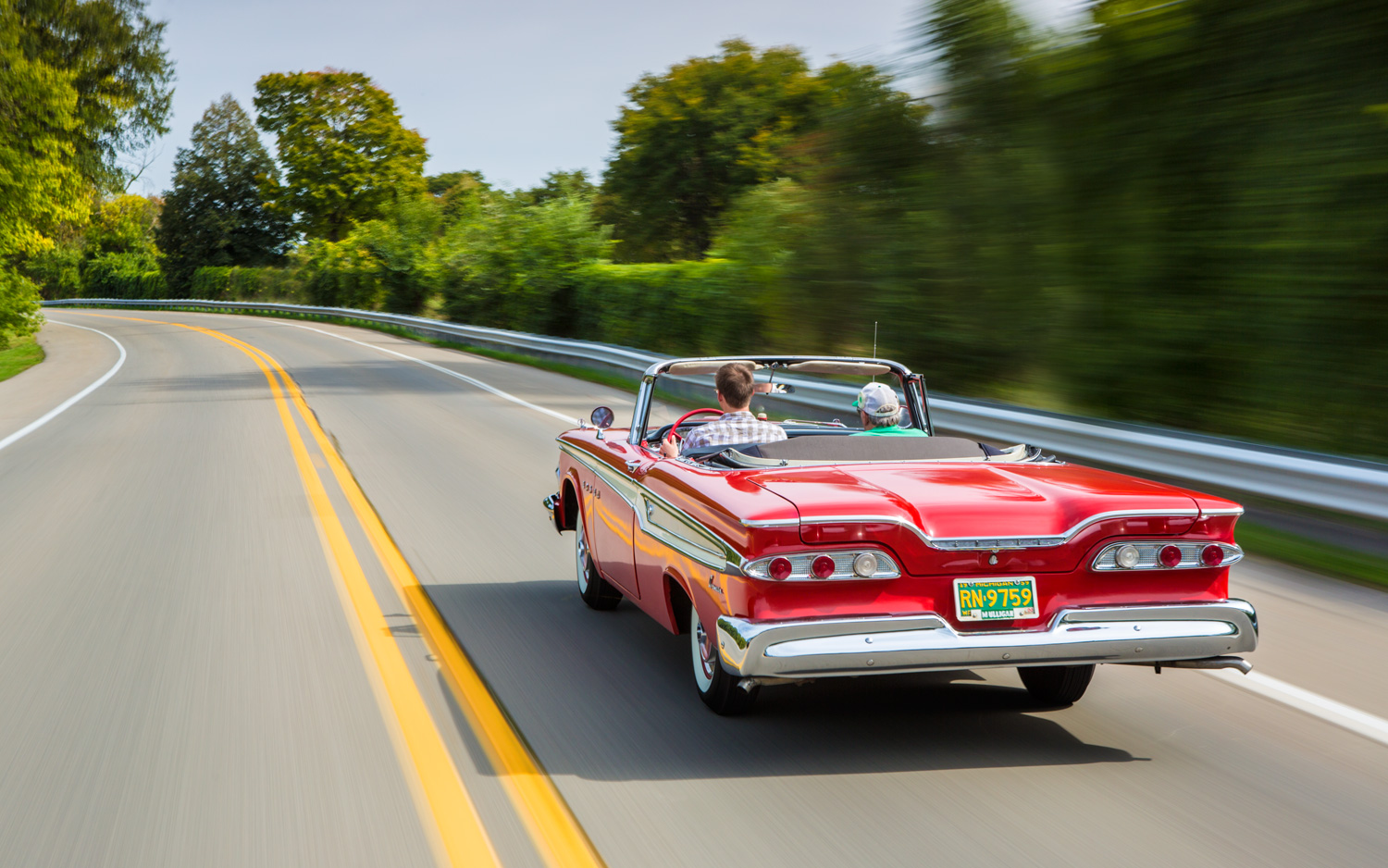 That makes Nickels's Corsair a rare machine. With the optional 361-cubic-inch V-8 (a 410 was dropped after 1958), a three-on-the-tree manual, and unassisted steering and brakes, the red droptop is equipped more like an enthusiast's toy than the top model of a near-luxury brand. A year earlier, Edsel had offered seven nameplates covering ten body styles and eighteen models. For 1959, the Corsair was reduced to trim differences over the Ranger with which it now shared a body.