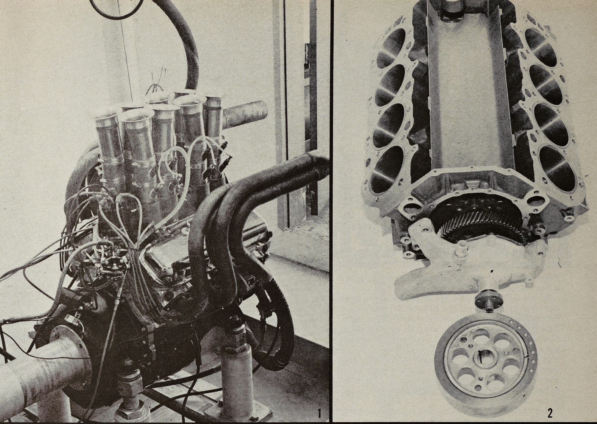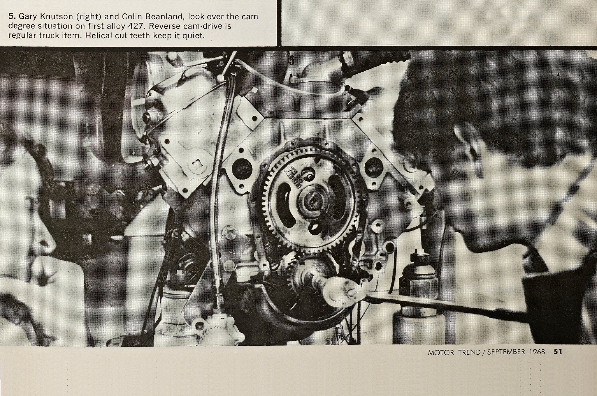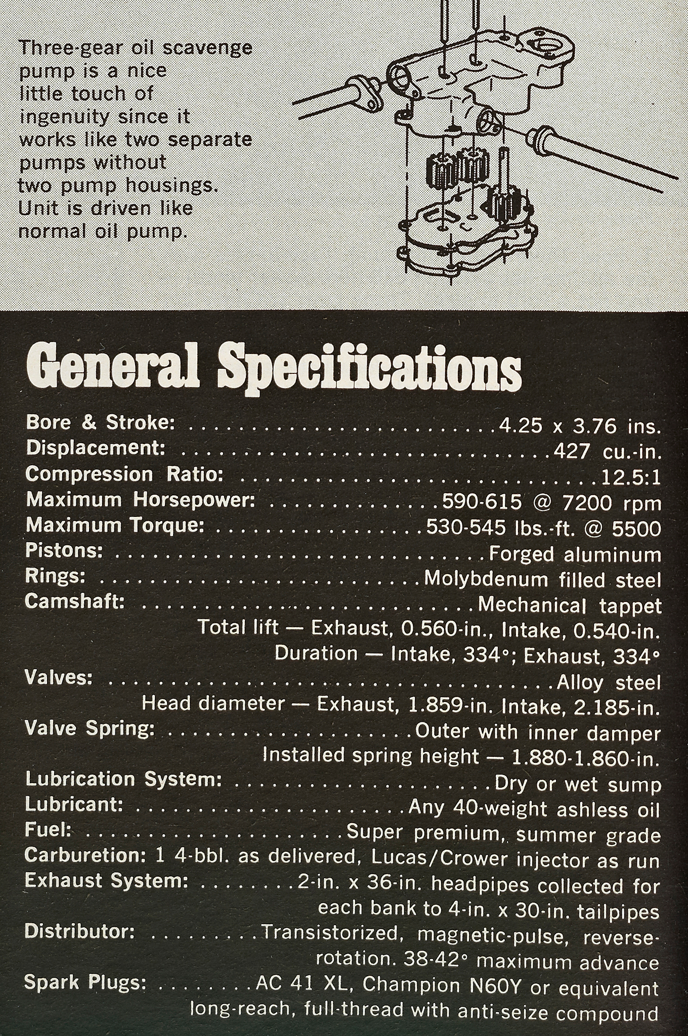 In the September '68 issue, our man Dahlquist got an invite to Bartz Engine Development in Van Nuys, California, for an early look at this all-aluminum hi-po big-block racing engine that was to be homologated with production variants. "There, spread out on newspapers on one of the workbenches, were all the pieces of this latest Chevrolet masterpiece. The block is made from 356 T-6 heat-treated aluminum, using 'loose-wood' patterns (like mahogany) that are pieced together. This, as you might guess, is a very limited-production process. The cylinder block is manufactured dimensionally in identical configuration to an L-88 427, except that the walls and main bearing webs are beefed up somewhat." He went on to note that what he was seeing was a second-gen design, benefiting from revisions to the crank, connecting rods, and L-88-style alloy cylinder heads. He also described the unique dry-sump scavenging arrangement. "The oil pressure pump is located in the aluminum timing cover and was cleverly adapted over from the Turbo Hydra-Matic transmission."