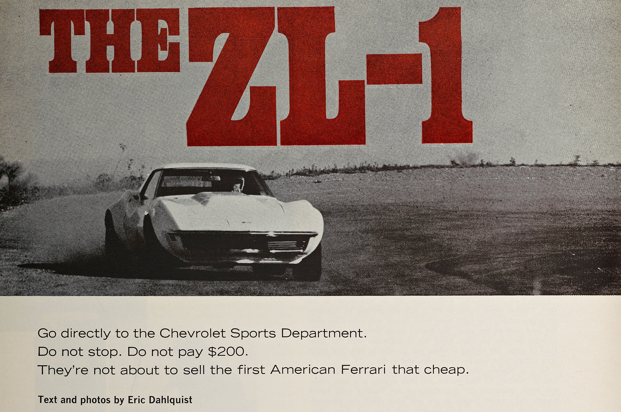 So blown was Dahlquist's mind when he first drove the ZL-1 that he opened his piece like Rod Serling introducing aTwilight Zoneepisode: "Button down your mind. Tight. Lock it in place and twist up the safety wire. You're on a trip to the border of your imagination. The front door of the terminal is the entrance of the nearest Chevrolet Sports Department, and they won't care if you run." The next graph was no less hyperbolic: "Sting Ray ZL-1. Say the name over in your mind, amplify it, taste it. It has the same sort of precise tonal delight as Lamborghini Miura or Ferrari 365 GT or Aston Martin DB6, and it is an iron-clad, money-back guarantee that individuality and something called élan, are alive and well in Detroit, at least as long as Zora Duntov is still there."