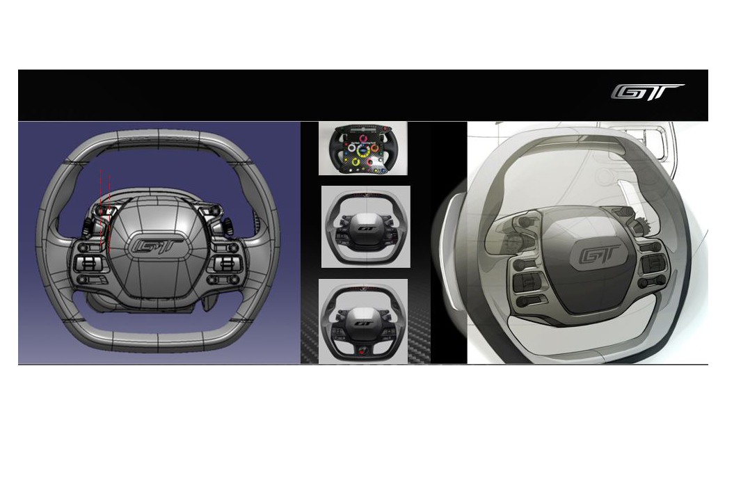 The GT's steering wheel was designed with the help of Ford's team of racing drivers. "They gave us their input, they told us what they wanted, what functions needed to be at hand," GT design chief Chris Svensson says. Controls include light and wiper/washer switches, the drive mode selector, turn signal buttons, audio, and cruise control. The paddle detents are magnetic, as in the GT race car, to give better precision and feel.