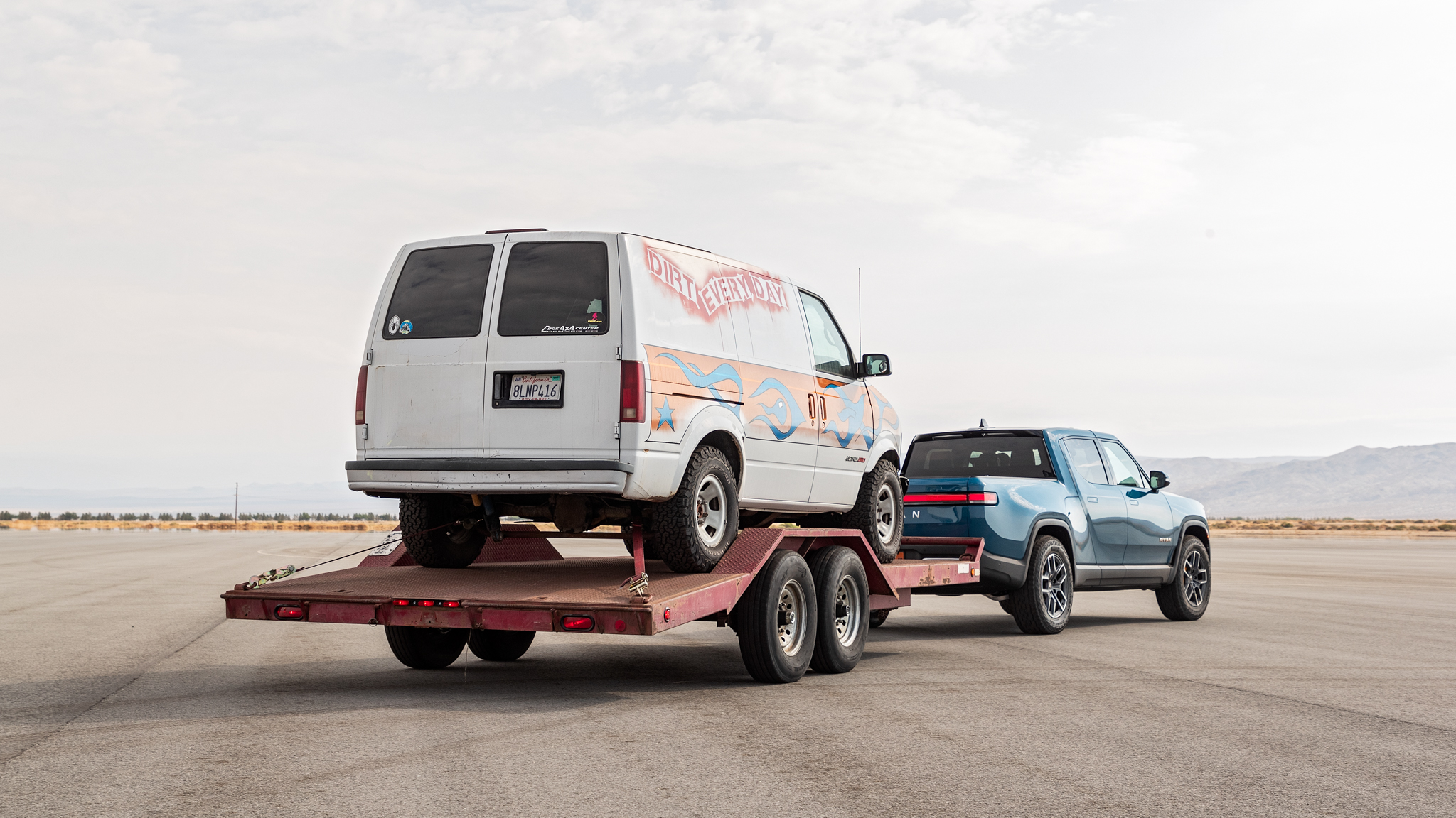 Our R1T was a Launch Edition equipped with the standard 135-kWh battery and 21-inch road wheel and tire package, EPA-rated at 314 miles of range. Our trailer was a flat tilt-bed car hauler loaded with theDirt Every DayChevrolet Astro van we stole out of the company storage lot, with the van itself loaded with 16 100-pound horse stall mats for ballast. In total, the trailer weighed 8,992 pounds and was hitched to our 7,134-pound R1T for a gross combined weight of 16,135 pounds. All R1Ts have a maximum conventional towing rating of 11,000 pounds, and the company claims pulling that load will cut your range by 50 percent to roughly 159 miles.