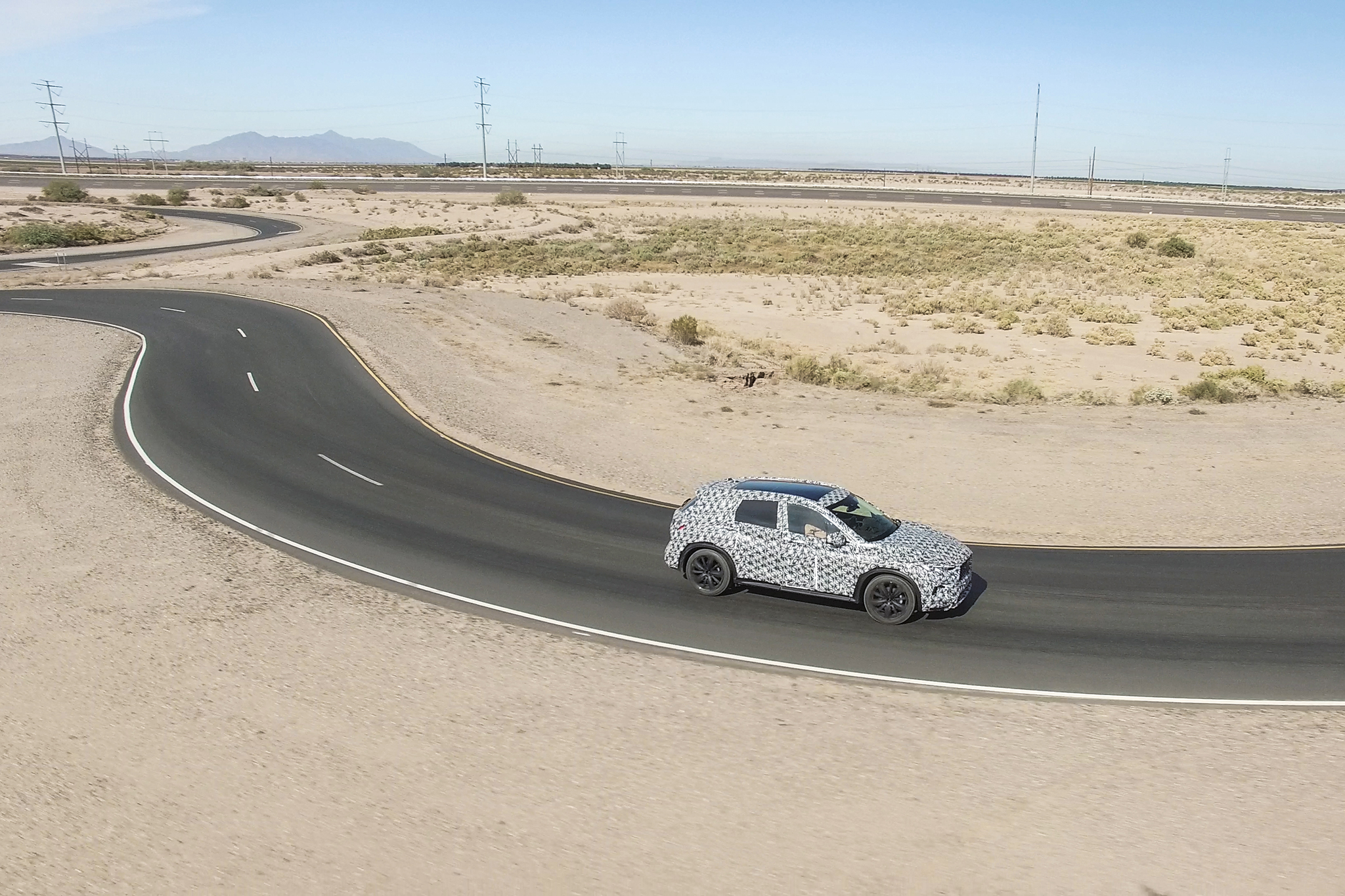But back to the driving: At Nissan/Infiniti's Arizona Testing Center (ATC) an hour outside Phoenix sat a prototype of the upcoming Infiniti QX50 outfitted as a powertrain mule—the car's suspension, interior, and camouflaged exterior weren't yet ready for evaluation, but VC-Turbo-equipped models won't bear any exterior badging marking the fact anyway. Under the hood, the 2.0-liter VC-Turbo, codenamed KR20—it is derived from the current Nissan/Infiniti MR20 2.0-liter turbo engine and the "K" stands for kahen, the Japanese word for "variable." Out the windshield, the ATC's enormous oval and some simulated country roads.