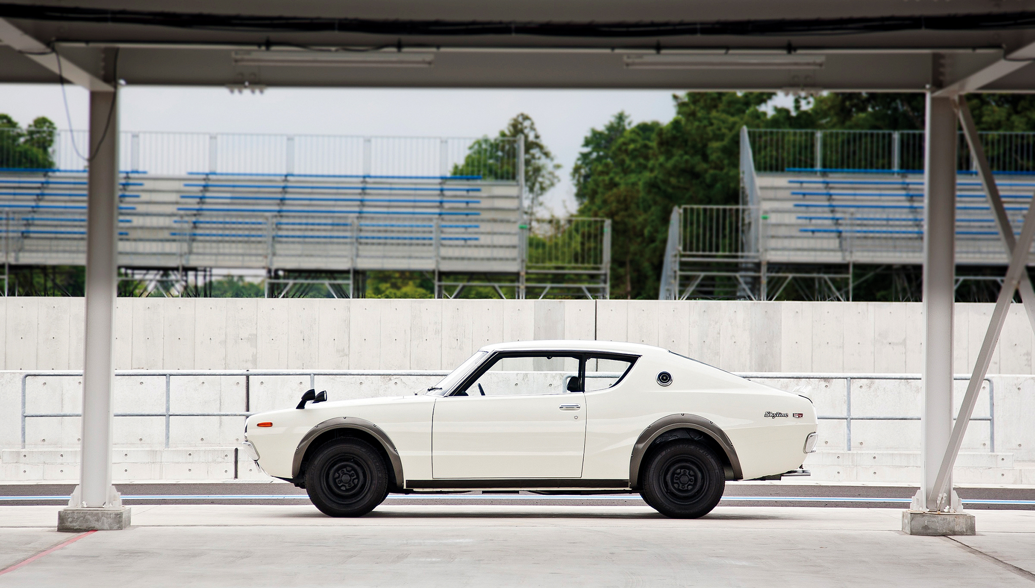 Though produced in the greatest numbers of early GT-Rs, Hakosuka coupes are widely considered the most valuable. It is easy to see why, as they're even more race-oriented than the four-door. To reduce weight and improve handling, the rear doors were dropped and the chassis shortened by 2.8 inches. The bucket seats do not recline, and the car sits lower with a large rear wing for better aerodynamics. Bolted-on rear overfenders—like the racing cars used—created a distinctly Japanese styling trend that persists to this day.