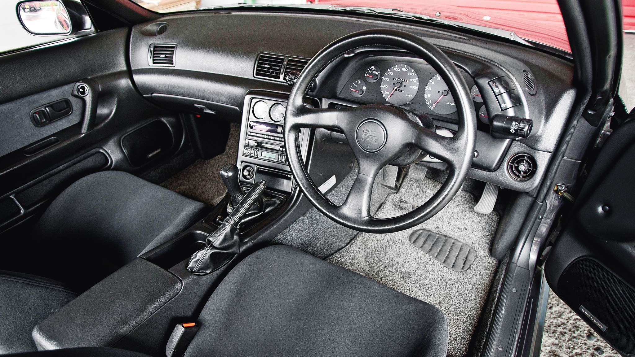 There is great visibility out of the Kenmeri's small, thin pillared greenhouse, and the non-reclining bucket seats, covered in black vinyl pitted like the surface of the moon, are surprisingly comfortable, but not as bolstered as you'd expect from a sports car. The cutouts in the dash for the missing heater plumbing validate the GT-R's sporting intentions.