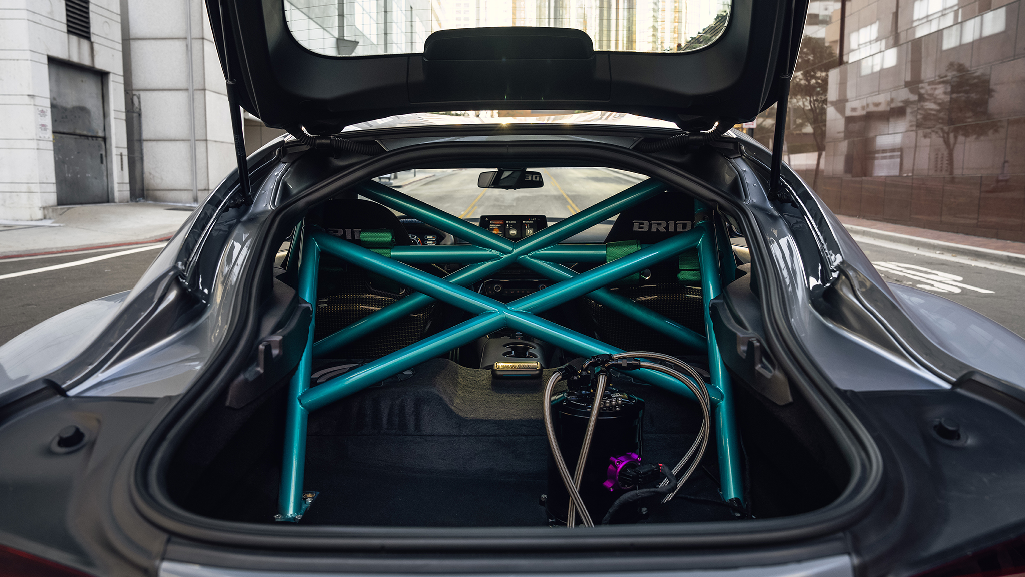 InteriorBride Gias II carbon Kevlar-backed seats; Takata harnesses; Vertex steering wheel; Project Mu pedals, shift knob; Mobile Weld Specialist custom roll cage; AIM Sports MXL digital cluster, datalogger