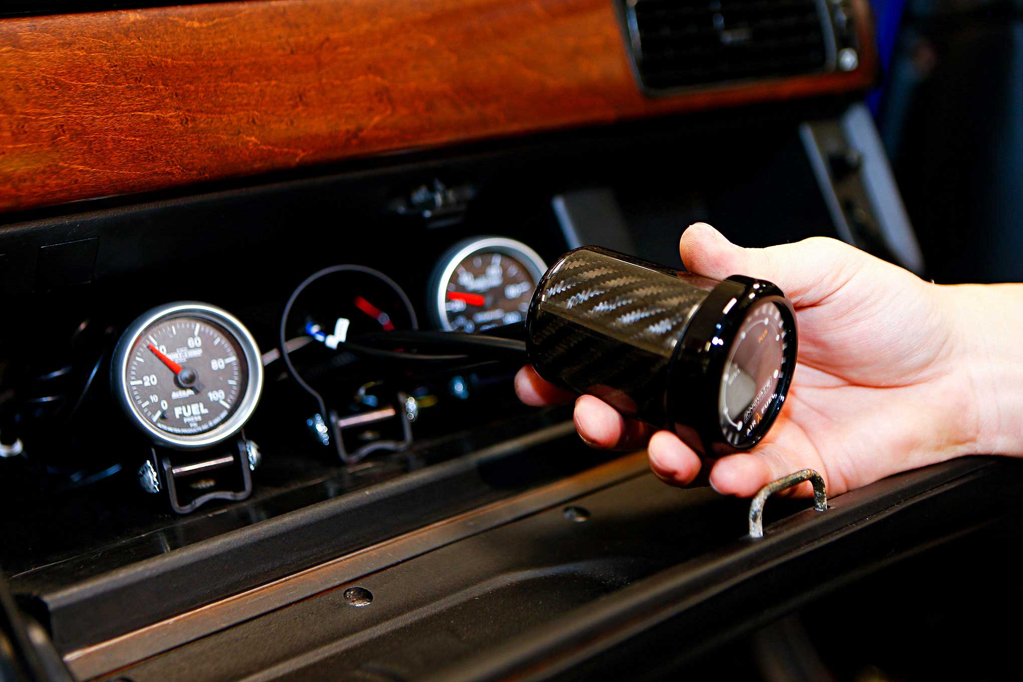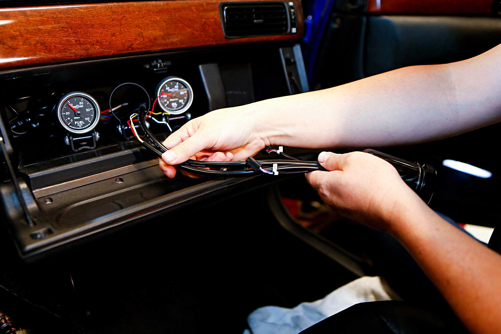 With connections complete, Harris feeds the wires through the glove box where the gauges are mounted and slips the gauge into the pod.