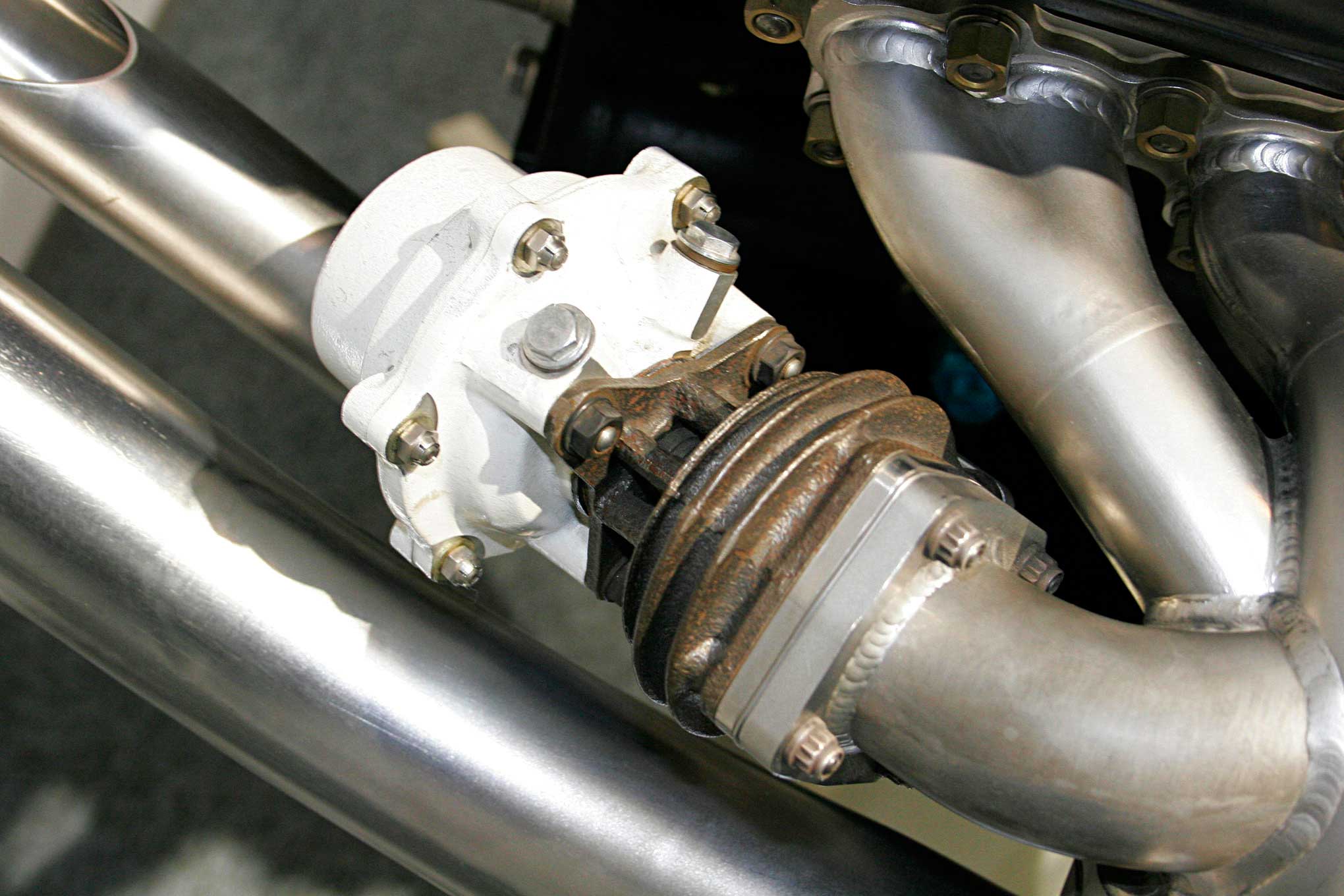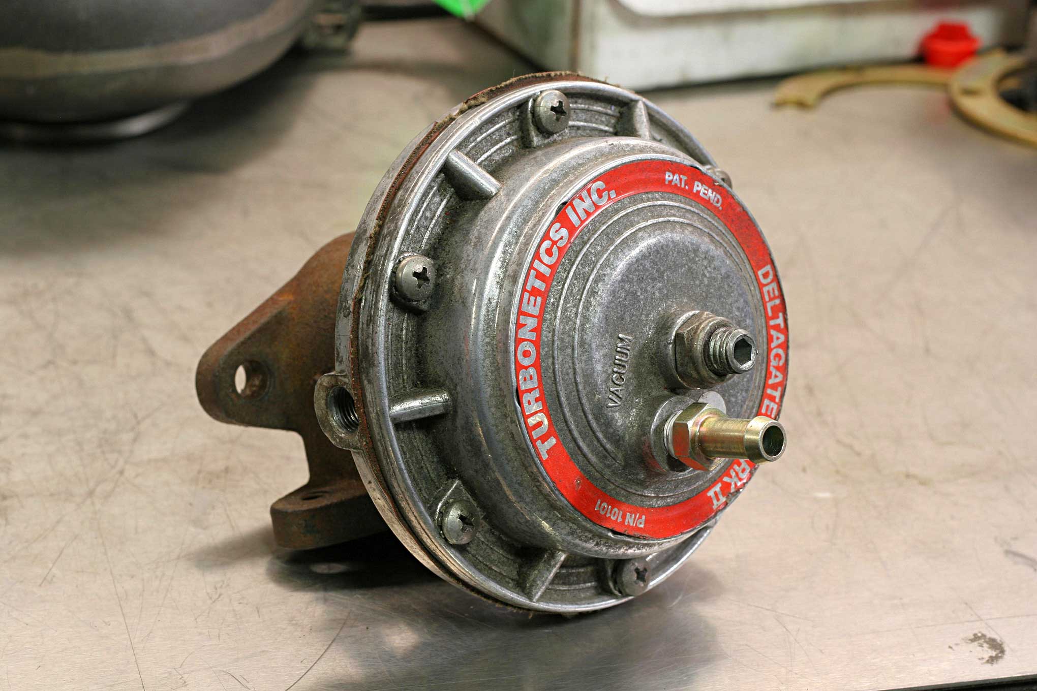Early versions of consumer-minded external wastegates weren't terribly complex. This early '90s Deltagate from Turbonetics featured a 7-psi spring, a reference port for a boost controller, and an adjustment screw on top that allowed for small changes in boost pressure.