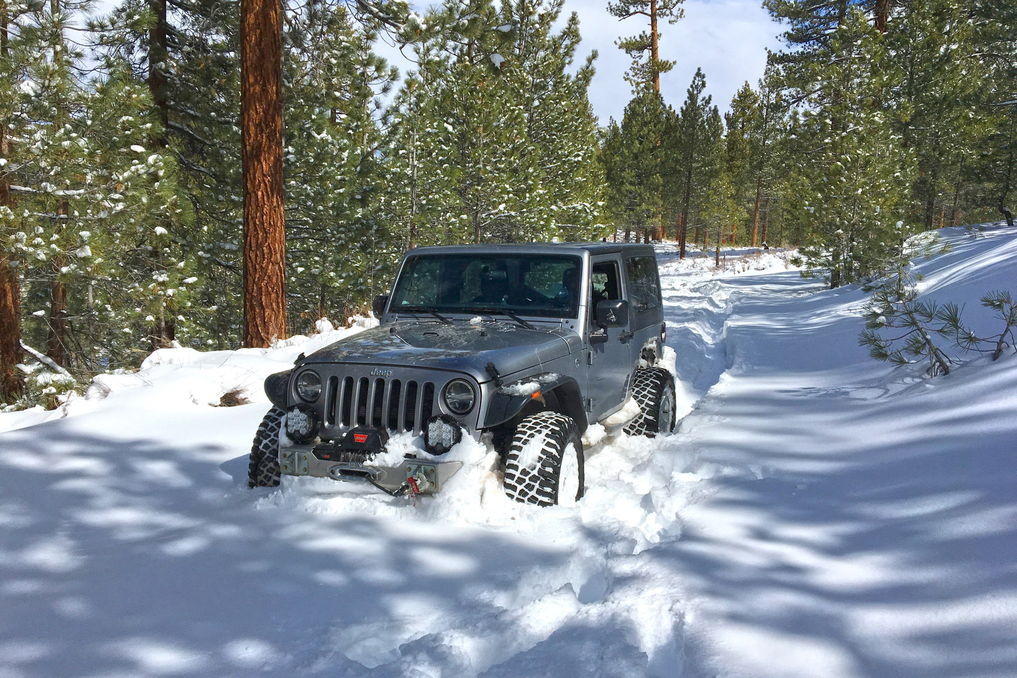 Deep snow proved to be a challenge—not to the tires, only the Jeep. Eating through shin-deep powder to find mud and rocks below was easy, even to the cold rubber. The tread blocks tossed out the snow while the tires spun down to terra firma. Even in off-camber snowy tracks we had enough lateral grip to maintain our lines and avoid sliding off the shelf roads. Despite the Jeep being low to the ground and pushing snowplow-style through the deeper snow, we were impressed at how far we were able to dig through the forest roads before the winch cable was unspooled.