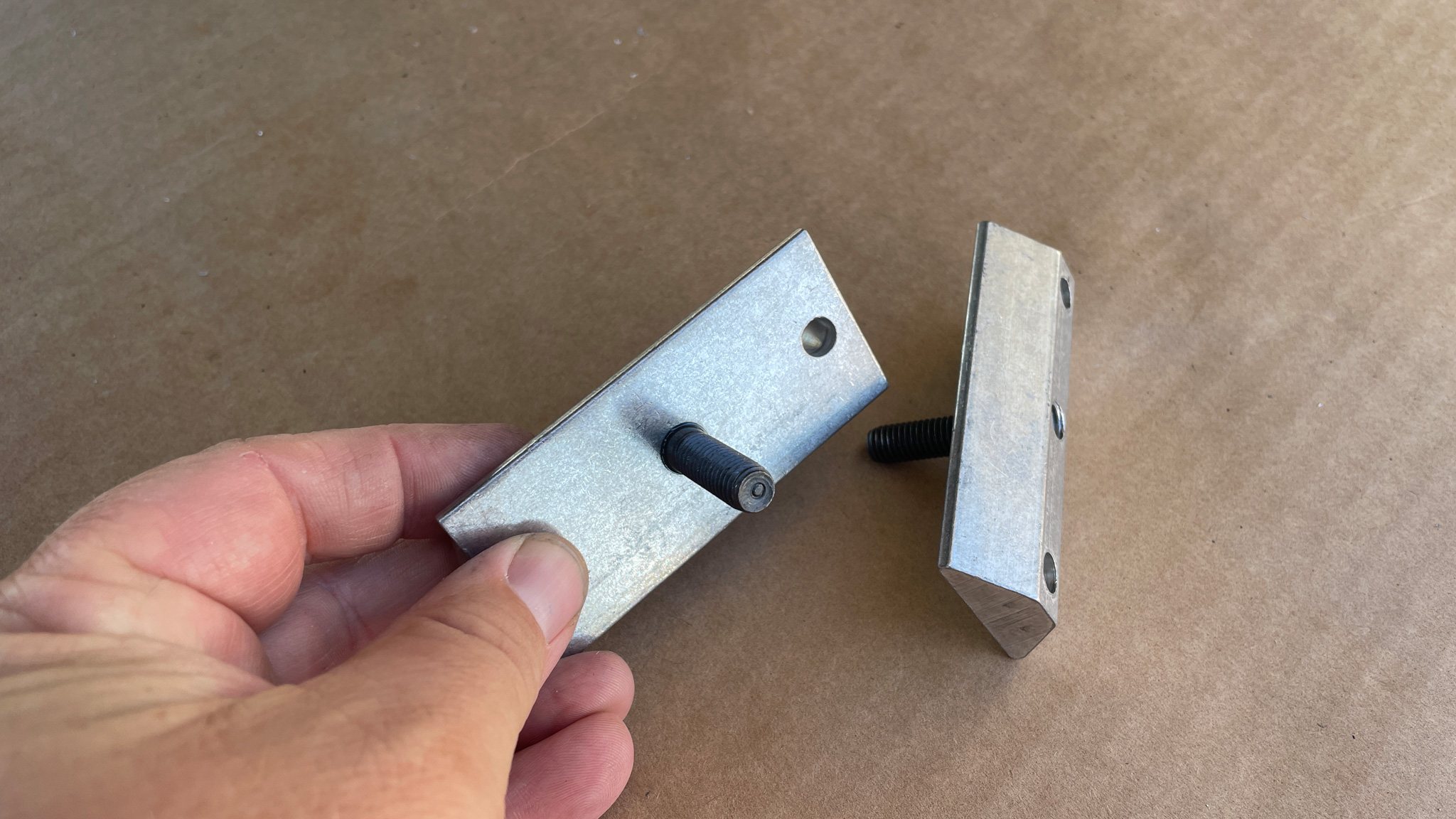 GM vehicles like our Chevy Silverado 2500 HD use an upper center-support to help hold the swing arms in place. These aluminum wedges attach the swing arm to the vehicle by way of an adjustable L-bracket. The adjustability in the bracket allows for manufacturing variances between vehicles, along with allowing for slight adjustments to the swing arm's final closure location as it relates to the body.