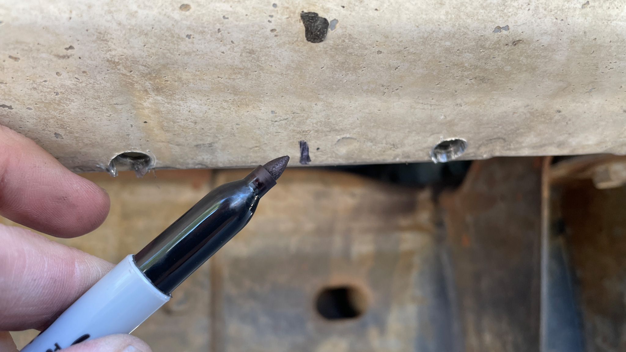The drill template gets held in place with a pair of vise-grip pliers near the sill drains (small humps) on the underside of the truck's rocker panels. The actual location in relation to the sill drains varies slightly depending on Chevy truck or SUV model.