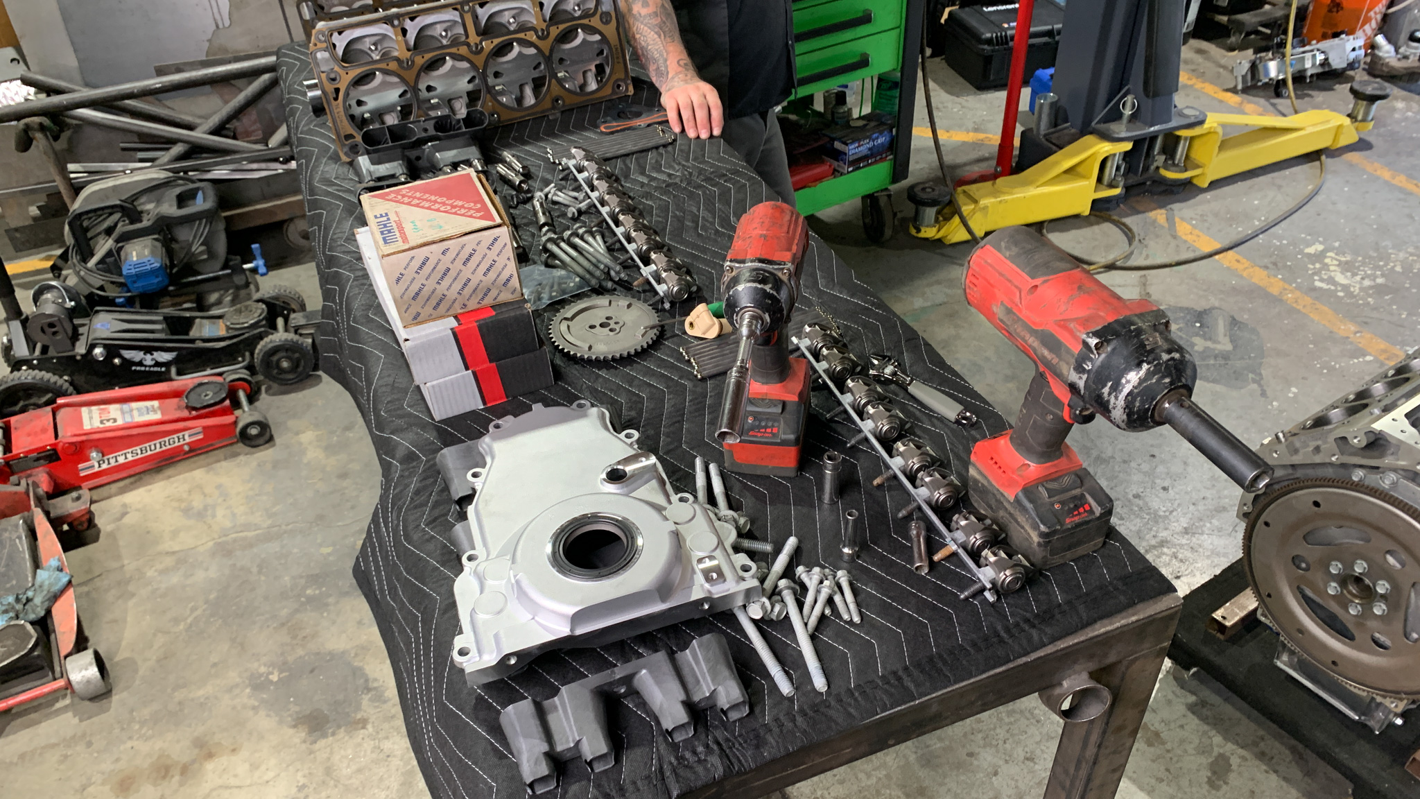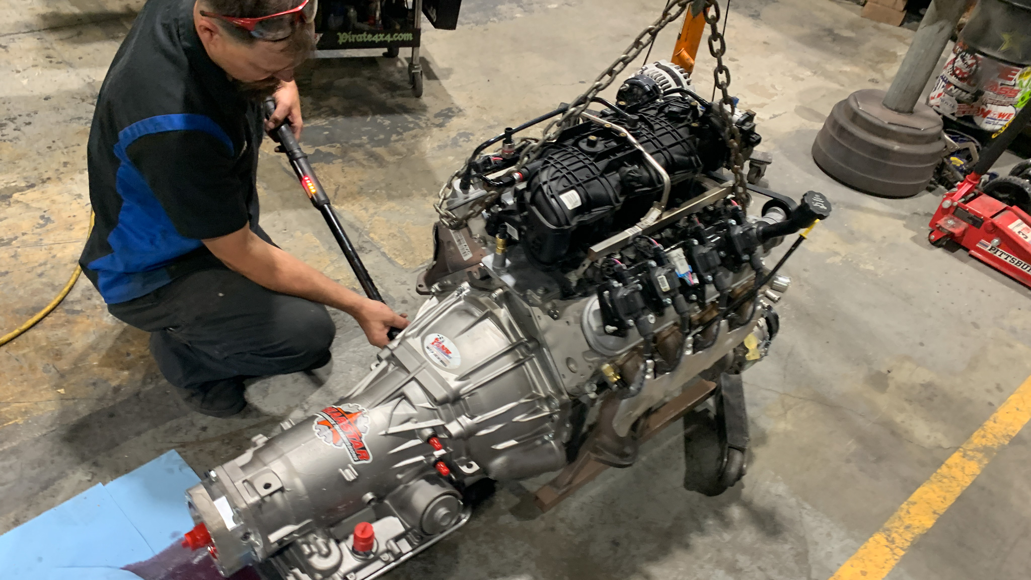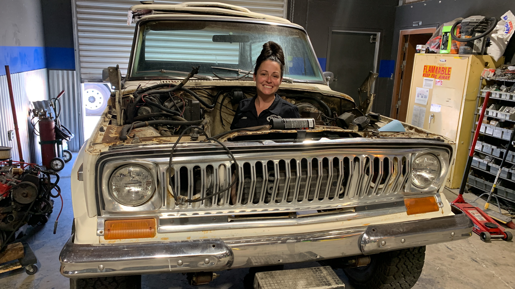 Not to be outdone, while Christian and Johnny were working on uncrating the Gearstar 4L65E transmission, Amber Mayo dove into the empty Chief engine bay to degrease and paint it so it looked nice when the new LS engine went in.