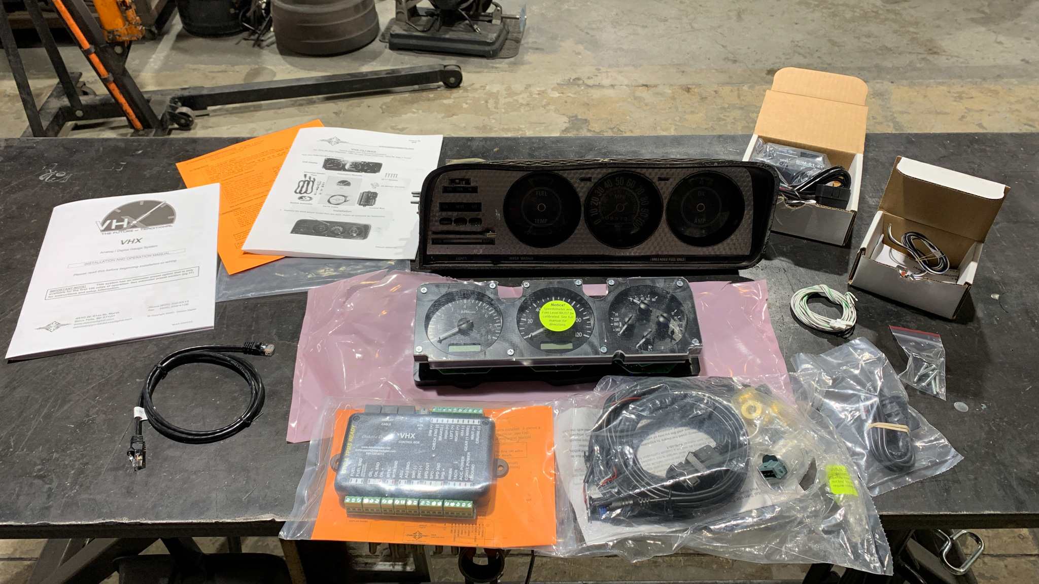 With the engine securely bolted in place it was time to tackle the wiring, beginning with plugging in the Holley Terminator X harness. While Kory and Shayne handled that, Johnny built a custom mount to house the control boxes for the Holley Terminator X and Dakota Digital VHX Series gauges that cleanly fit inside the glovebox compartment. The Dakota Digital VHS gauges are exceptionally nice and fit perfectly inside the factory gauge bezel. They give a perfect means to monitor all the systems you care about like tach, speedometer, odometer, fuel level, oil pressure, temperature, voltage, and more, without taking away from the classic looks of the vintage interior. Kory is amazing at wiring and created a super-clean harness with Deutsch connectors for the Dakota Digital gauges on the bench. Then we plugged the Duralast AGM battery back in its place, finished all the electrical connections with new battery cables that Kory built, and attached all our Terminator X connections before buttoning it all up.