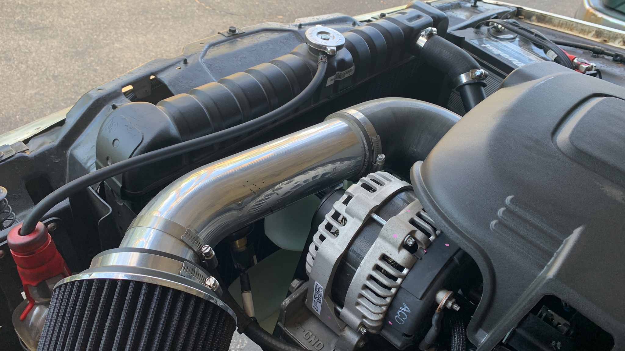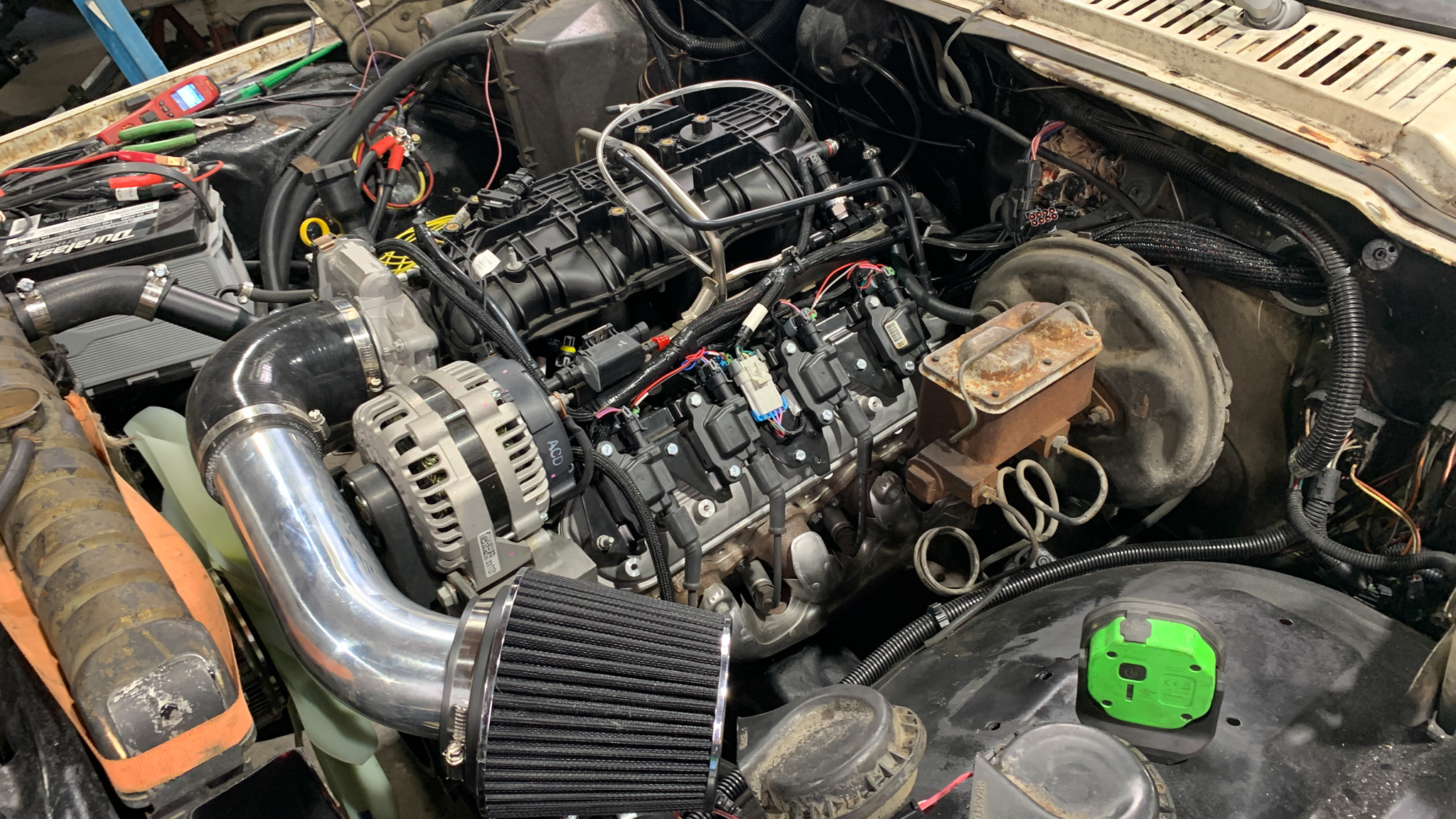 With the best build-crew ever, this project was straight-up flying forward, so much so that even after a relatively lazy start late Monday morning, by Wednesday evening we were finalizing the cooling system lines that retained the factory FSJ radiator and building an air filter setup in anticipation of its first fire. After a snafu, caused by Christian allowing the pickup and return lines to flop while installing the BJ's tank and then hooking the lines up backward on the Corvette regulator, the engine fired to life and settled into a nice idle with the Terminator X managing things beautifully.