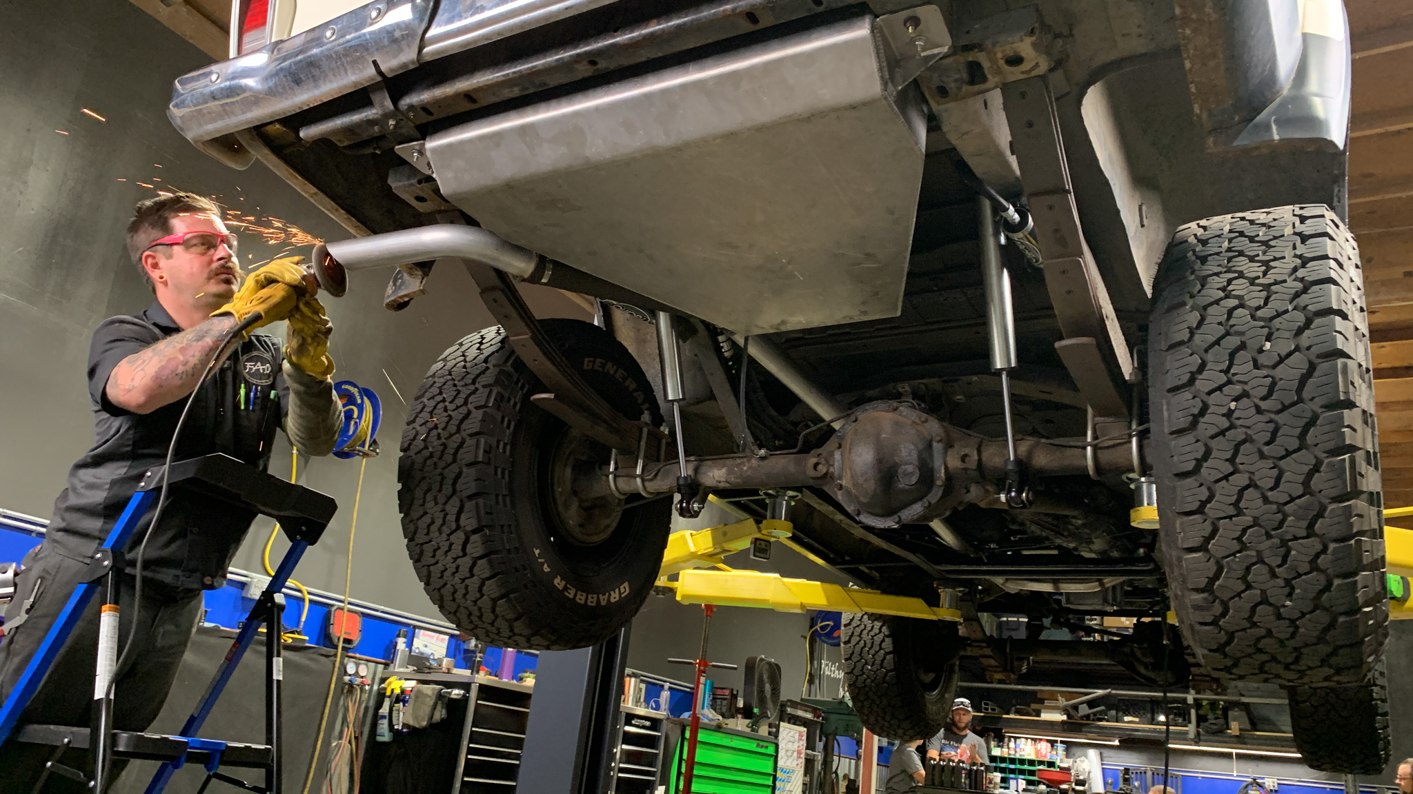 Now that the rig was a runner, Thursday just required Shayne to do his thing and build a super-slick exhaust using 2.5-inch Flowmaster mandrel bends and a 2.5-inch in/out Flowmaster 70-series chambered muffler. While Shayne was busy working up a gorgeous-looking and killer-sounding exhaust, Johnny and Christian got to work installing the Radflo Off Road 2.0 Smooth Body Remote Reservoir shocks. The Radflo shocks provide precise damping control with fade-free performance from an SSID steel tubing body with exceptional heat-dissipation. Radflo offers all sorts of shock lengths, types, and shaft and body diameters. Because the eyelet ends of the new Radflo shocks were for ½-inch mount, and the factory Jeep uses big clunky ⅝-inch pins, we cut out the stock Jeep pins from the factory upper mounts and replaced them with a heavy-wall DOM sleeve to accept a simple ½-inch shank bolt. The shocks were getting their final mounting just as Shayne was putting the wraps on the exhaust tip cut.