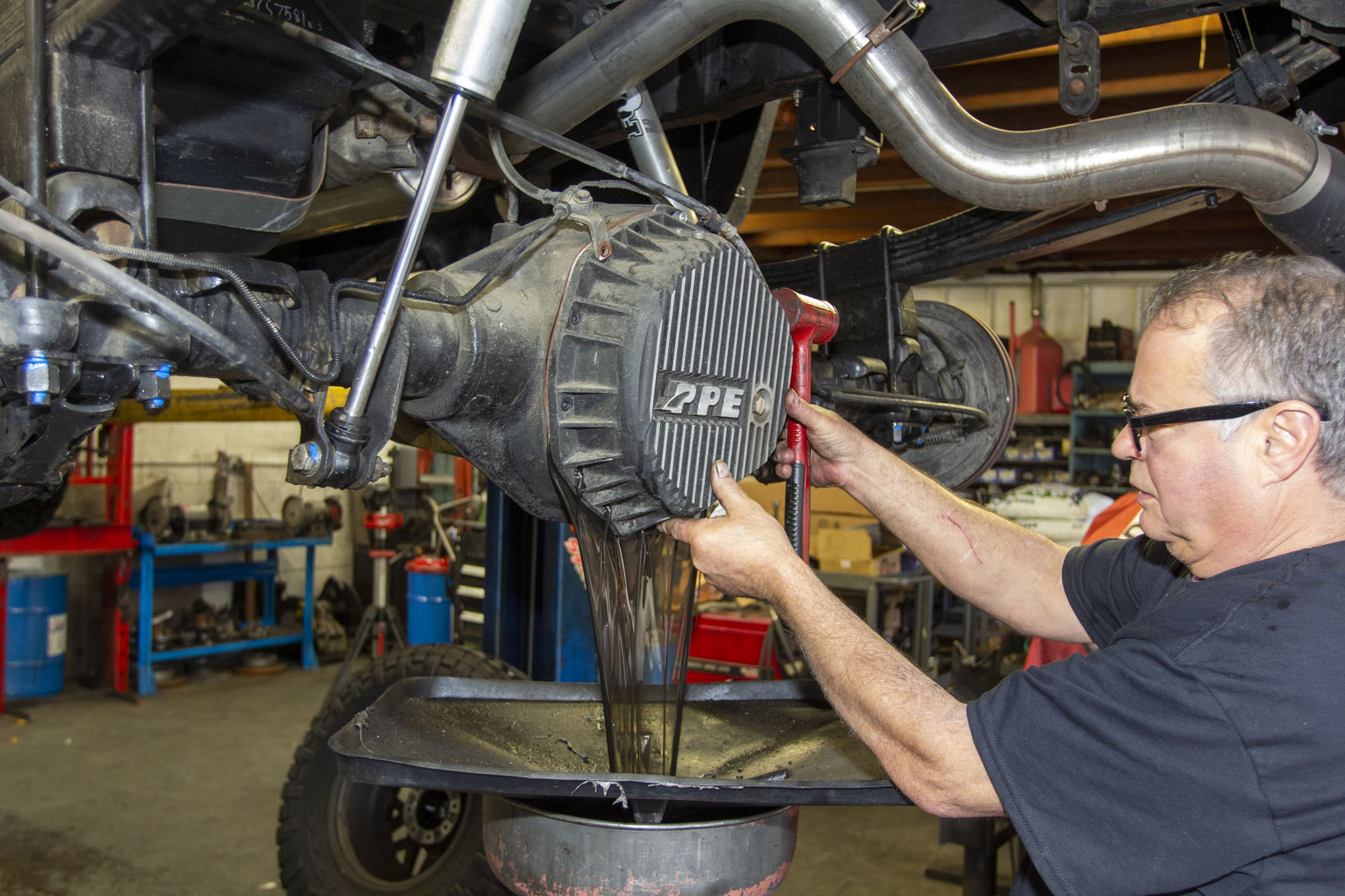 Next up, the rear differential cover is removed and the fluid drained. Be sure to leave at least one of the top bolts partially threaded as this helps control the flow of gear oil out of the differential.