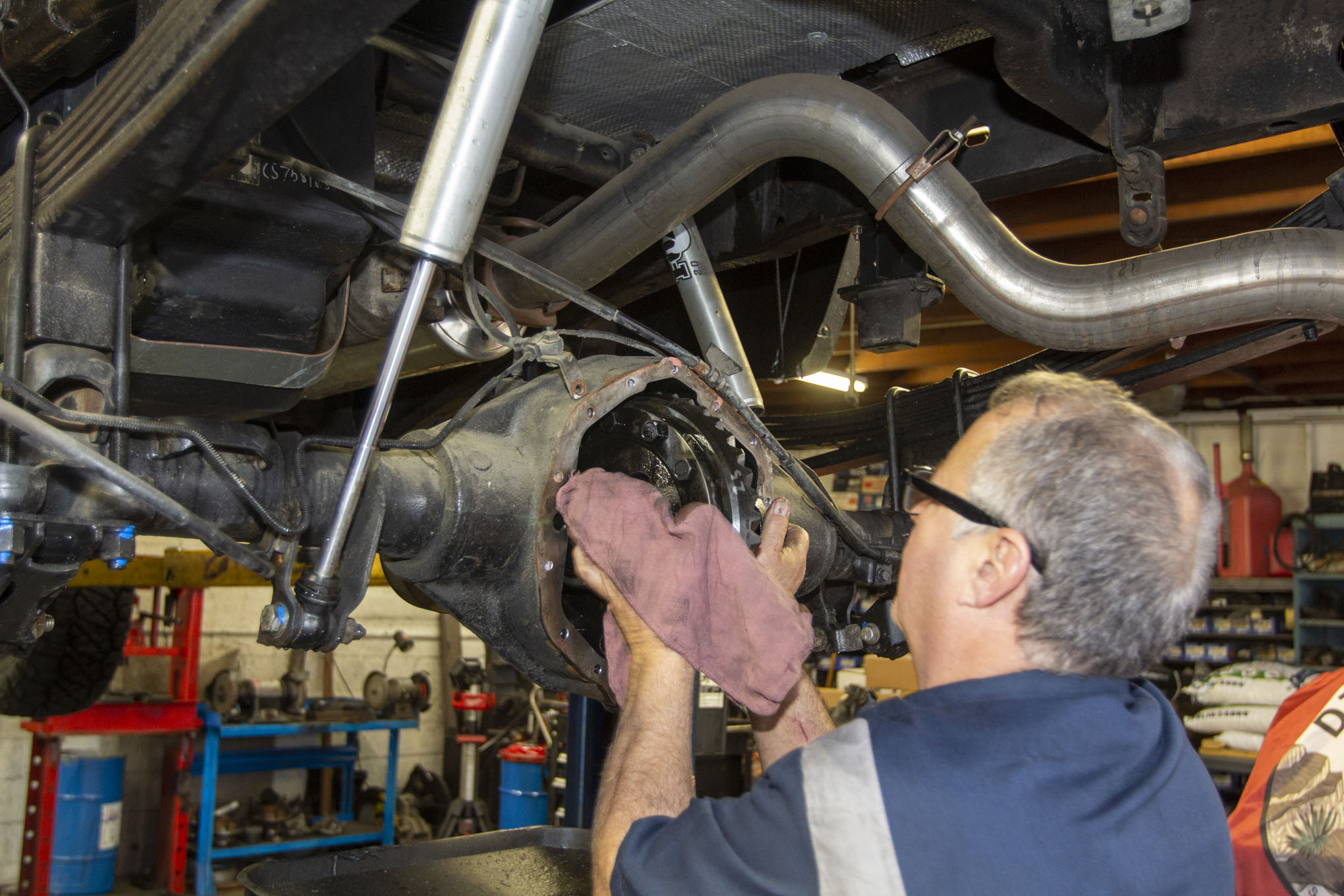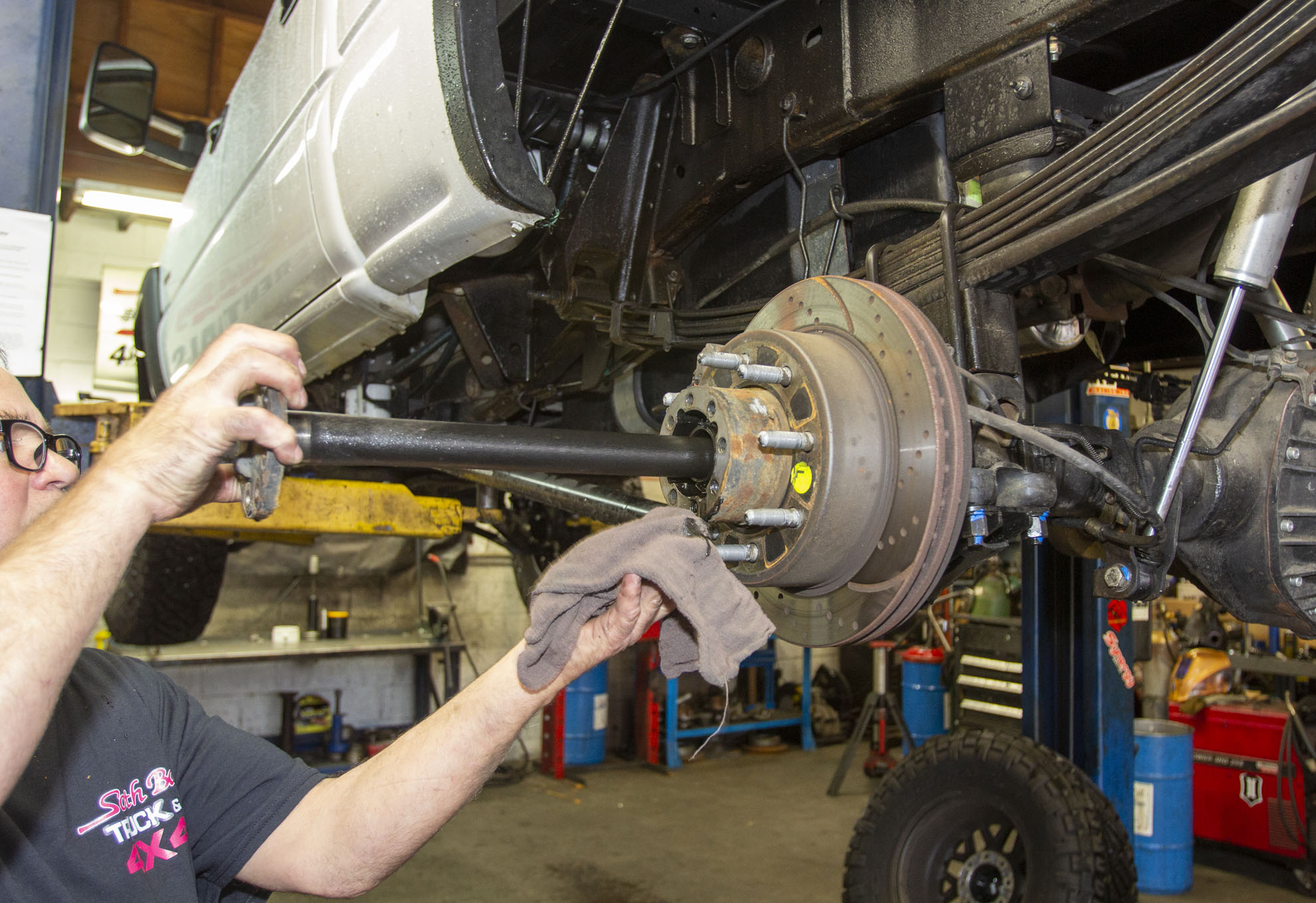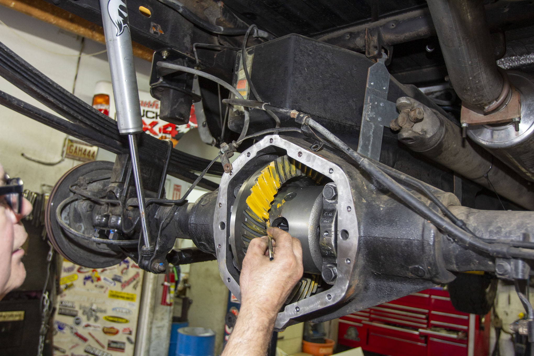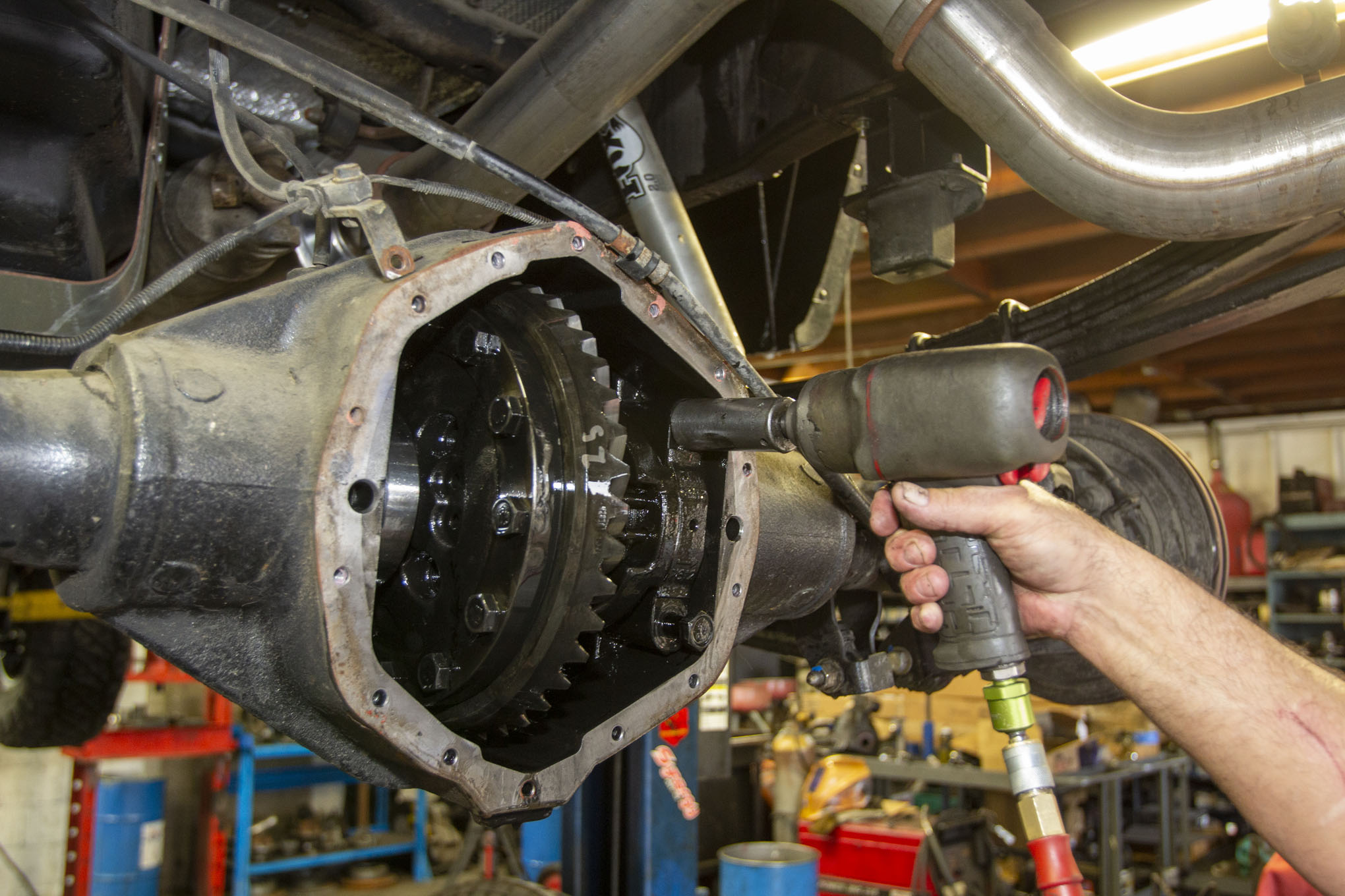 After getting the truck up on the rack and removing the rear tires, Frank Gilliland set to work by first removing the truck's rear driveshaft from the pinion yoke. The shaft was then strapped up and out of the way for the duration of the gear install, although it could just as easily have been fully removed.