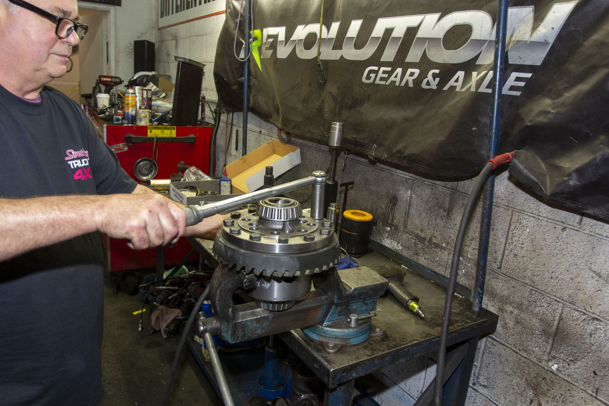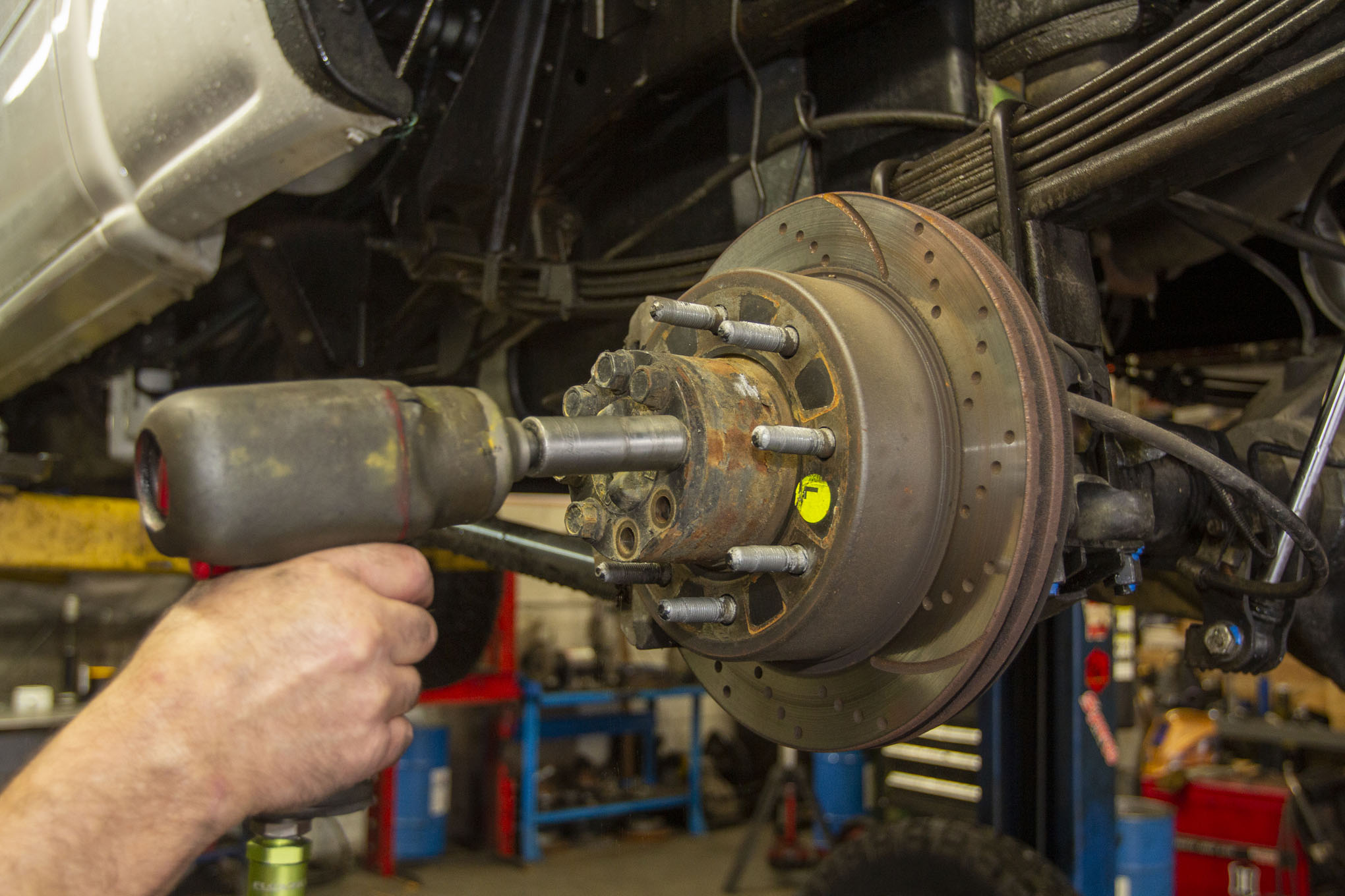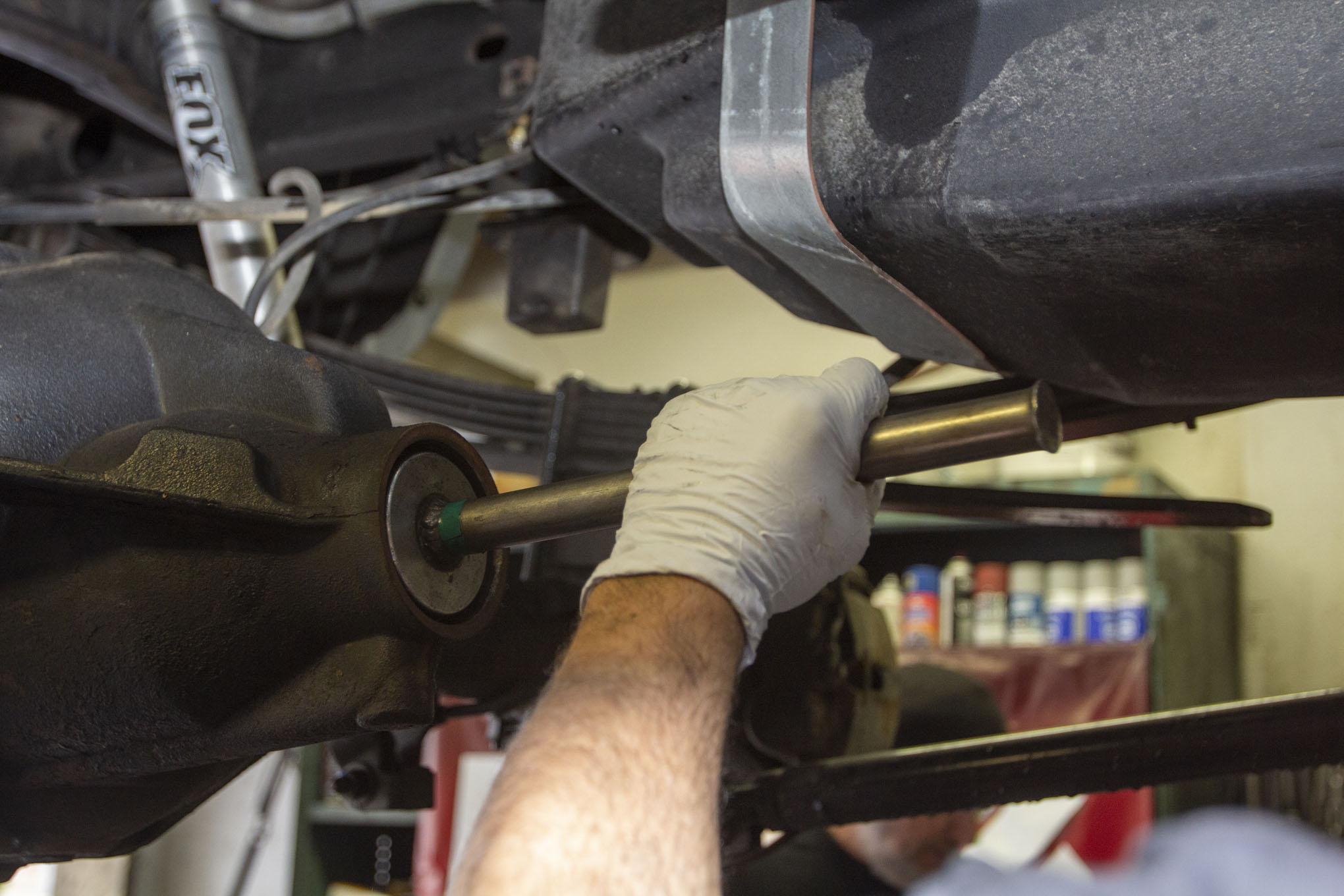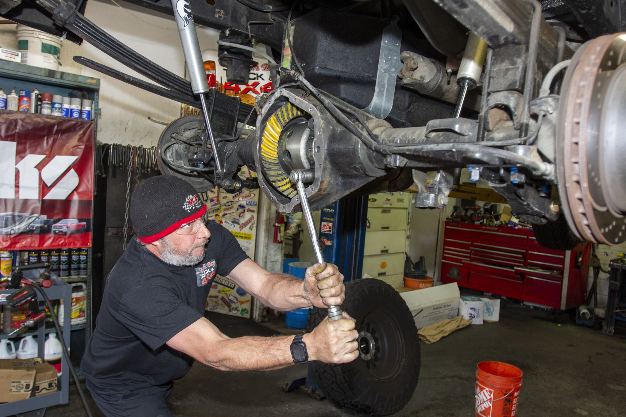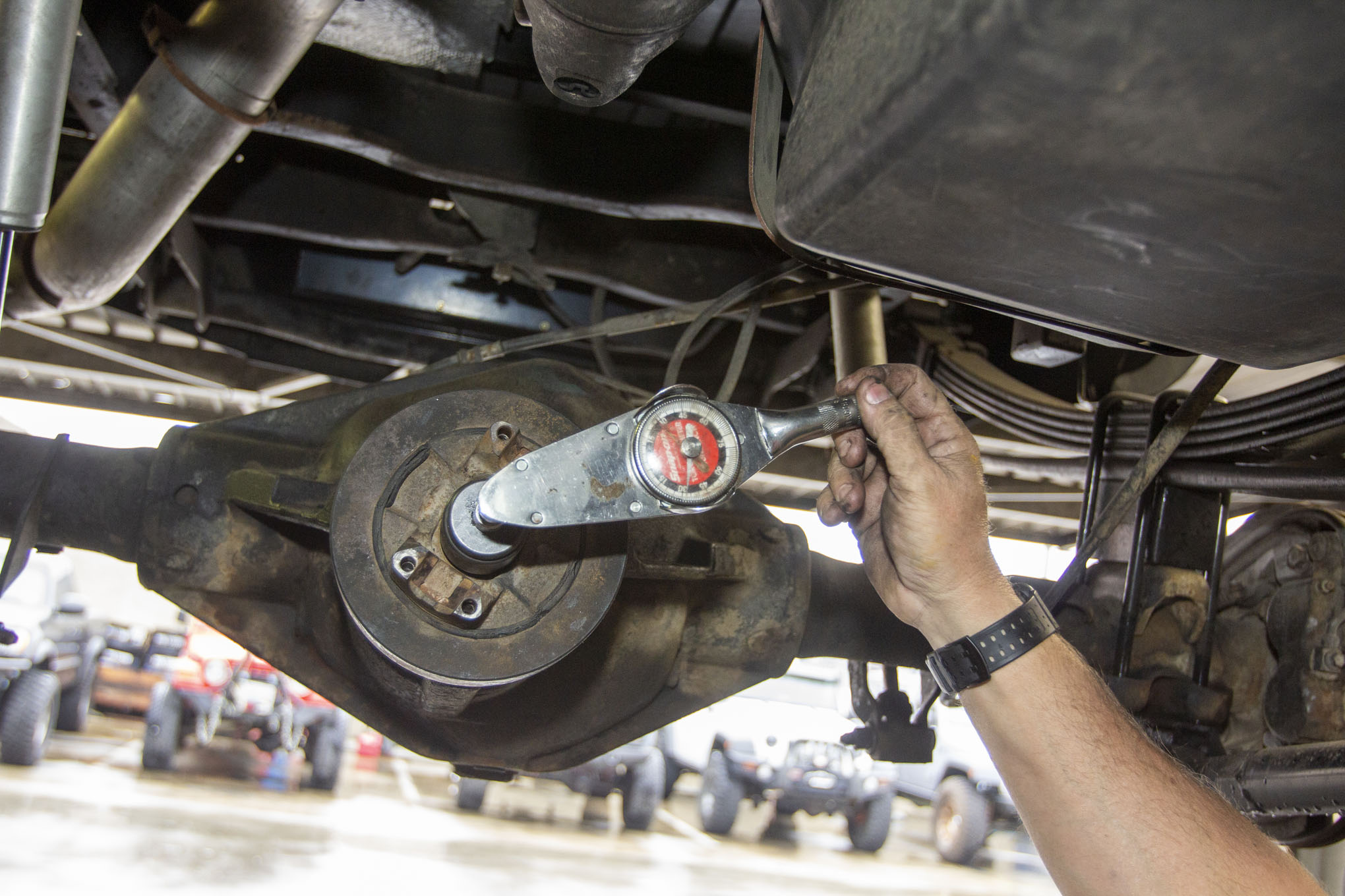 After getting the truck up on the rack and removing the rear tires, Frank Gilliland set to work by first removing the truck's rear driveshaft from the pinion yoke. The shaft was then strapped up and out of the way for the duration of the gear install, although it could just as easily have been fully removed.